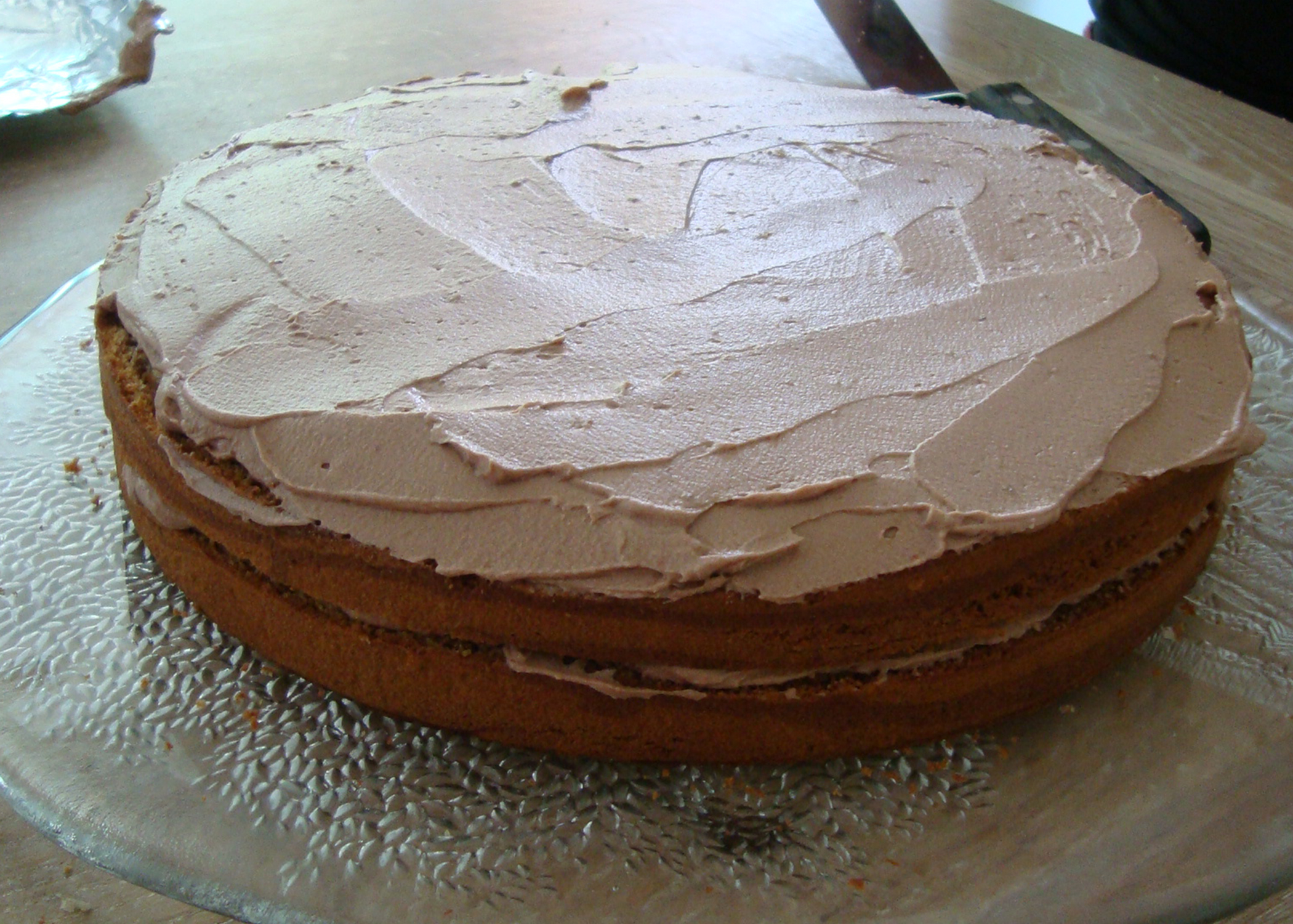 Zuerst den einen Viertel auf den untersten Boden streichen und gleichmässig verteilen. Anschliessend den zweiten Boden darauflegen und mit dem anderen Viertel der Masse wiederum gleichmässig bestreichen.