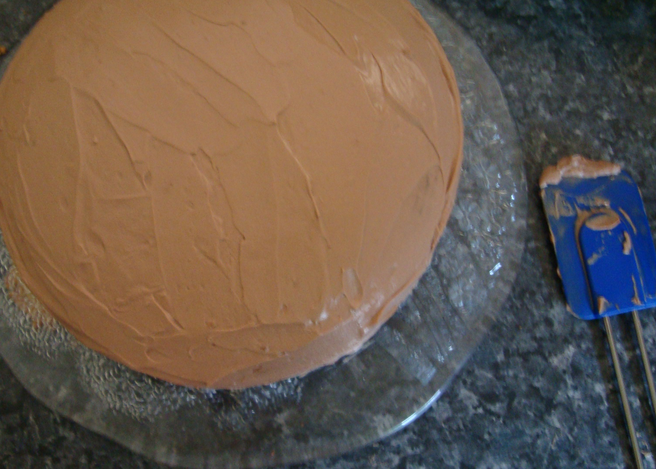 Den Deckel darauflegen und die gesamte Torte mit der restlichen Schokoladenmasse überziehen.