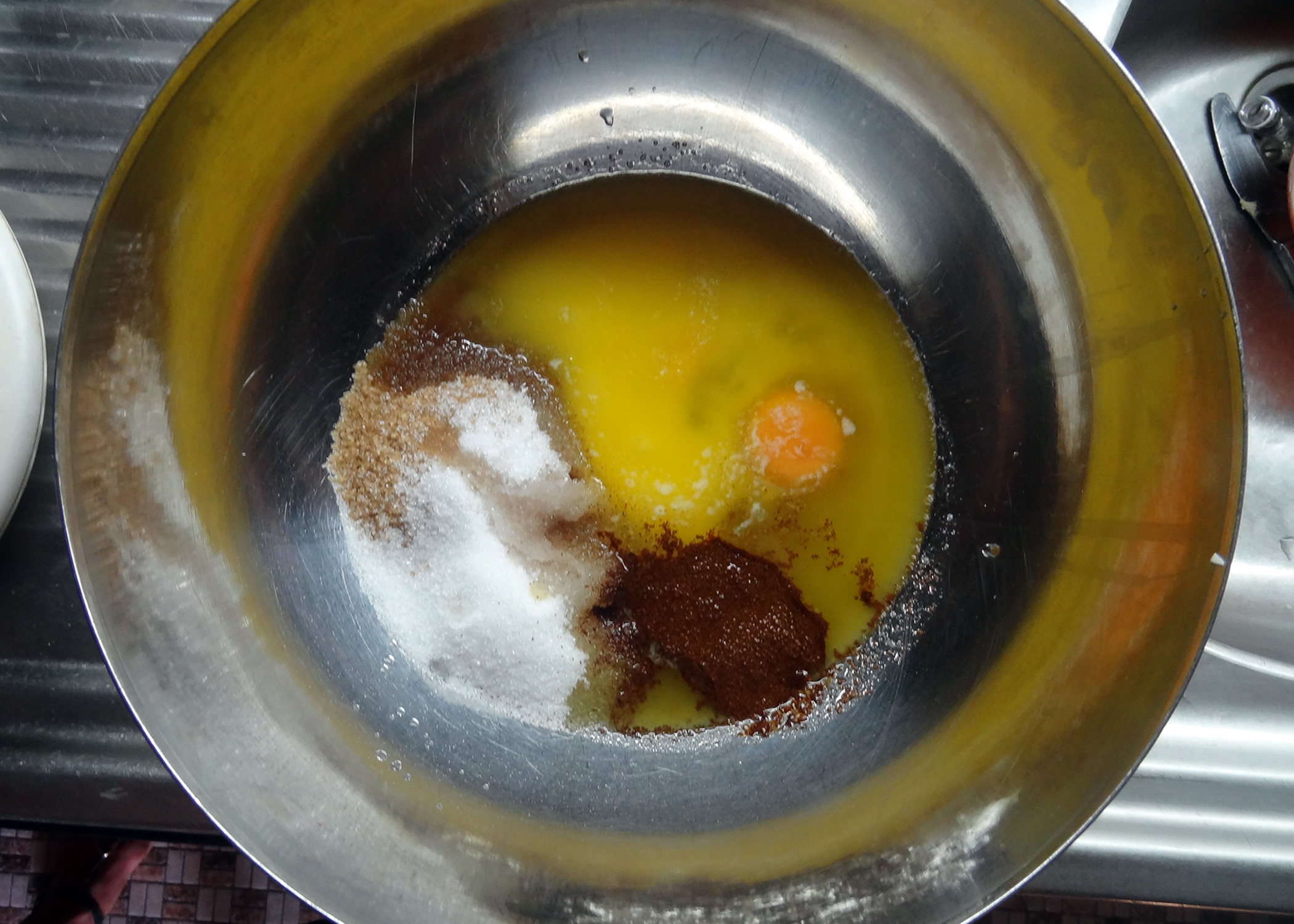 Für den Teig die geschmolzene Butter, Eier, brauner und weisser Zucker, Incarom und Vanilleextrakt kurz verrühren.
