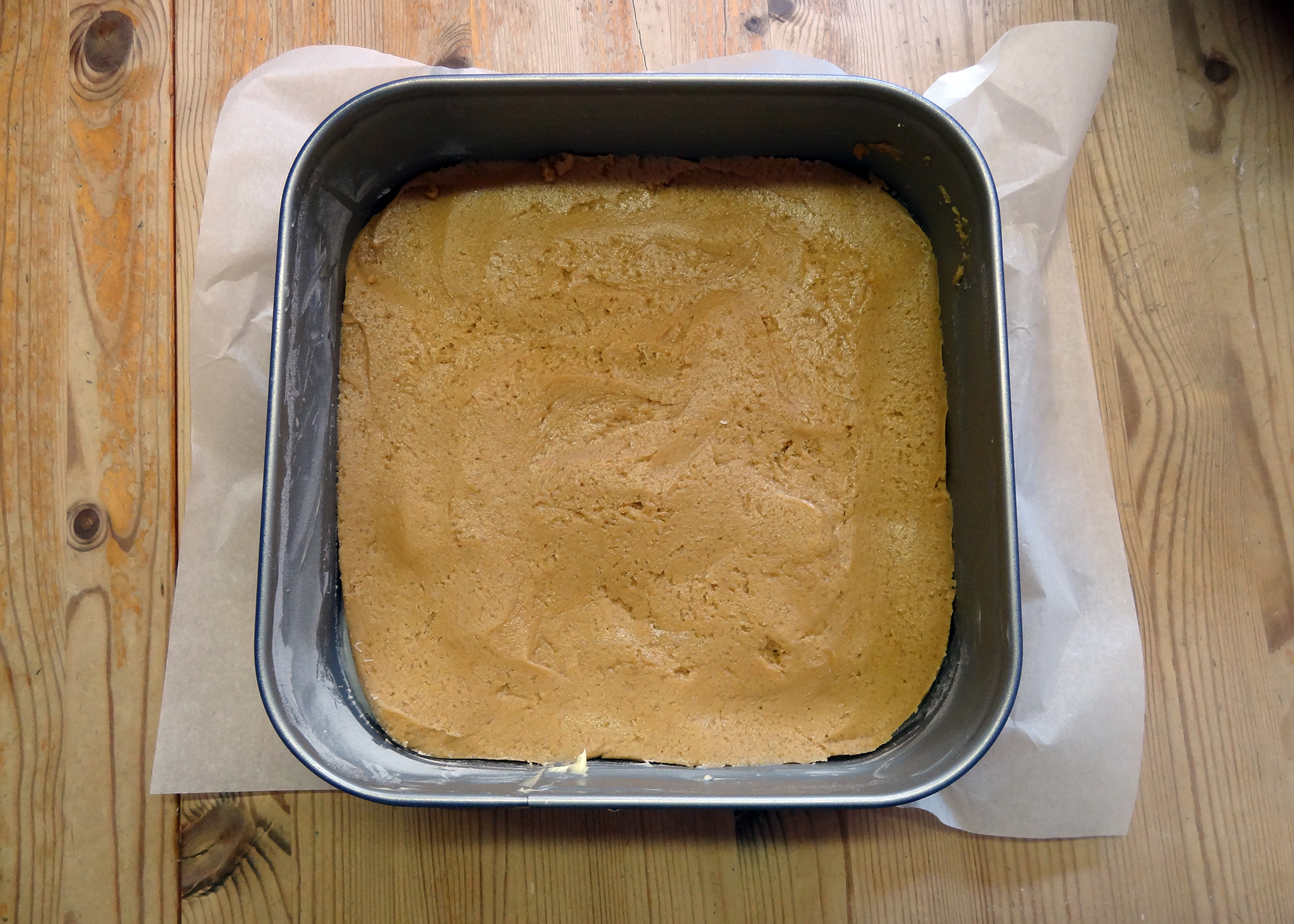Etwas Teig (siehe Foto) beiseite stellen. Den Rest in die Form verteilen und etwas andrücken.