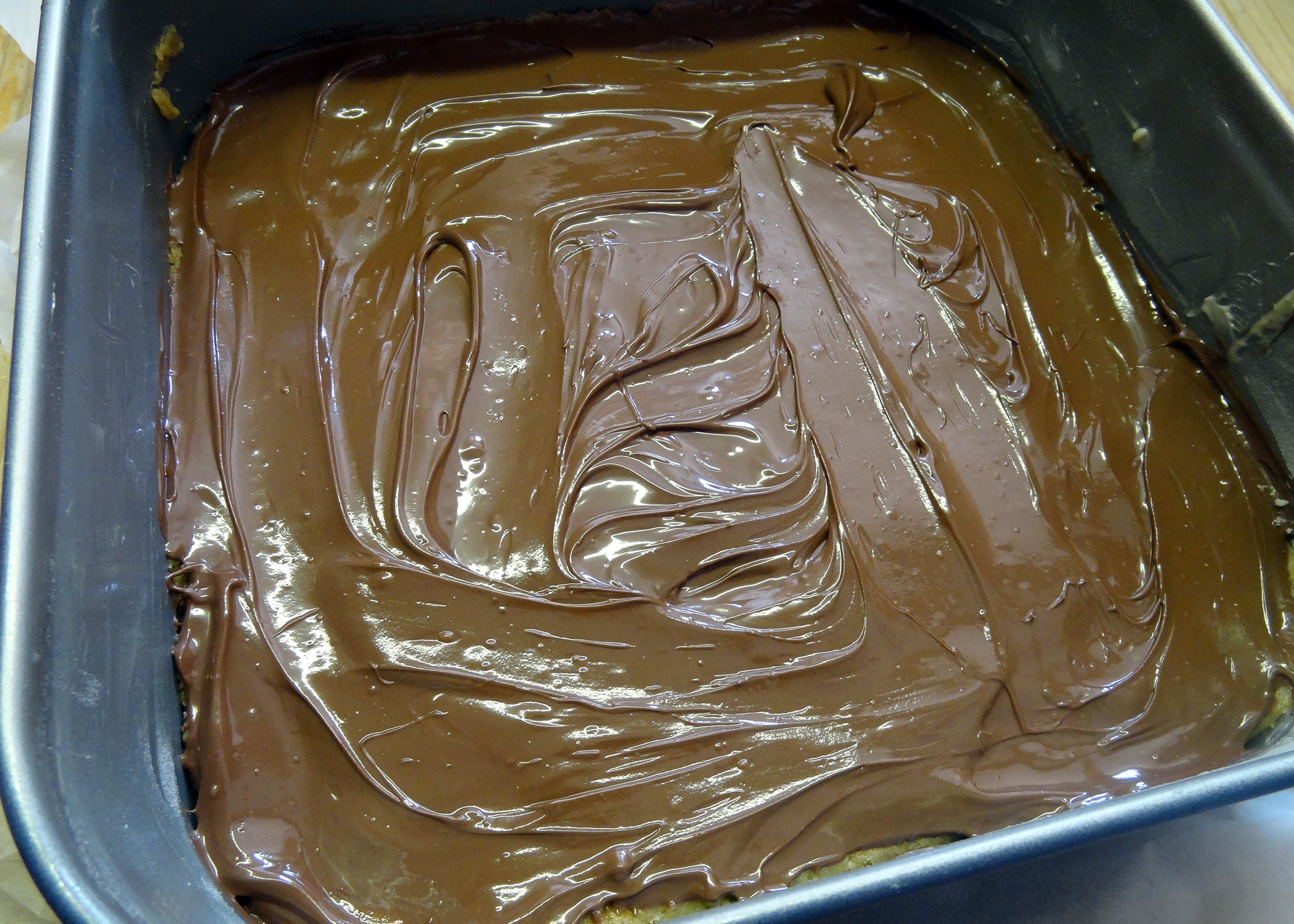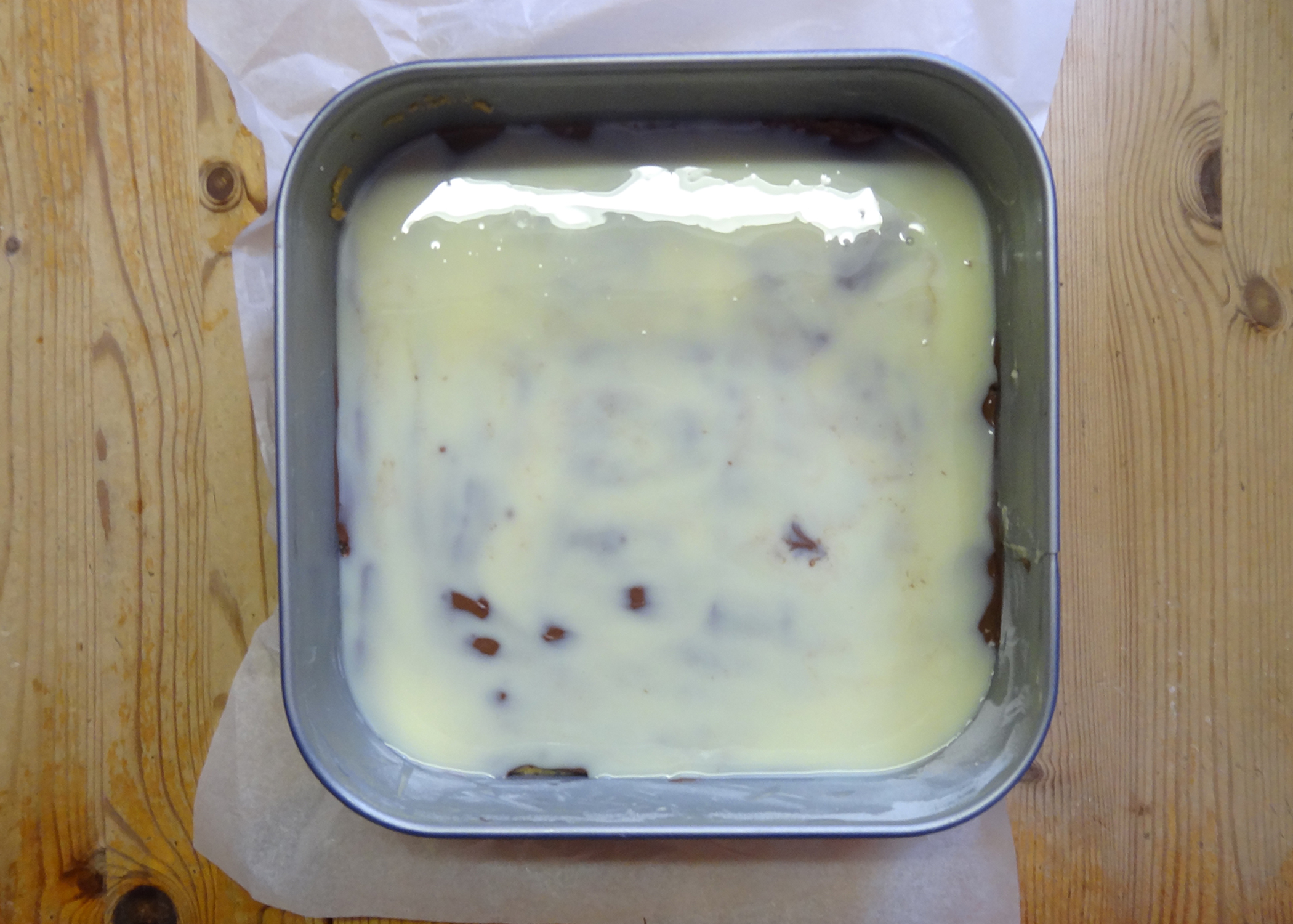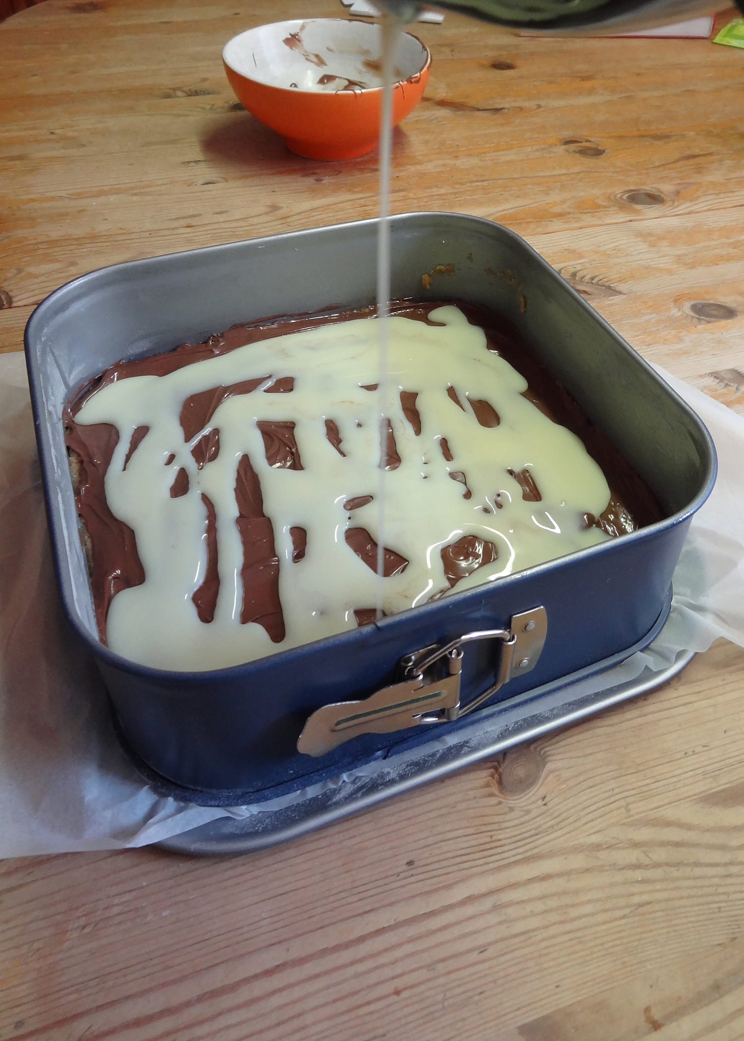 Nun zuerst das Nutella gleichmässig auf dem Teig verstreichen. Anschliessend die Kondensmilch darauf verteilen. Zum Schluss den beiseite gestellten Teig in kleinen Fladen auf der gesamten Form verteilen, sodass ein Grossteil der Kondensmilch nicht mehr zu sehen ist.