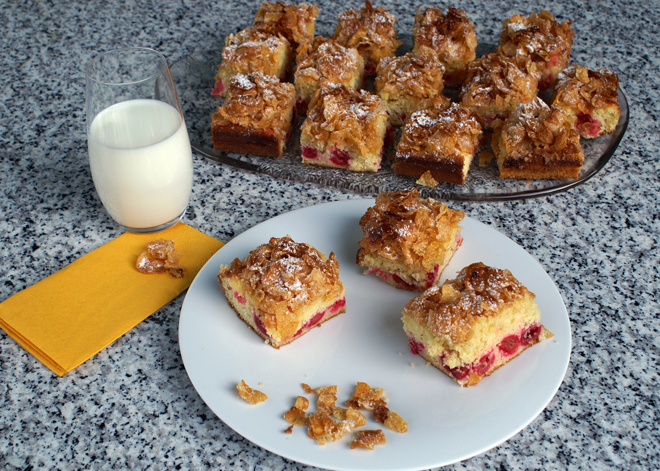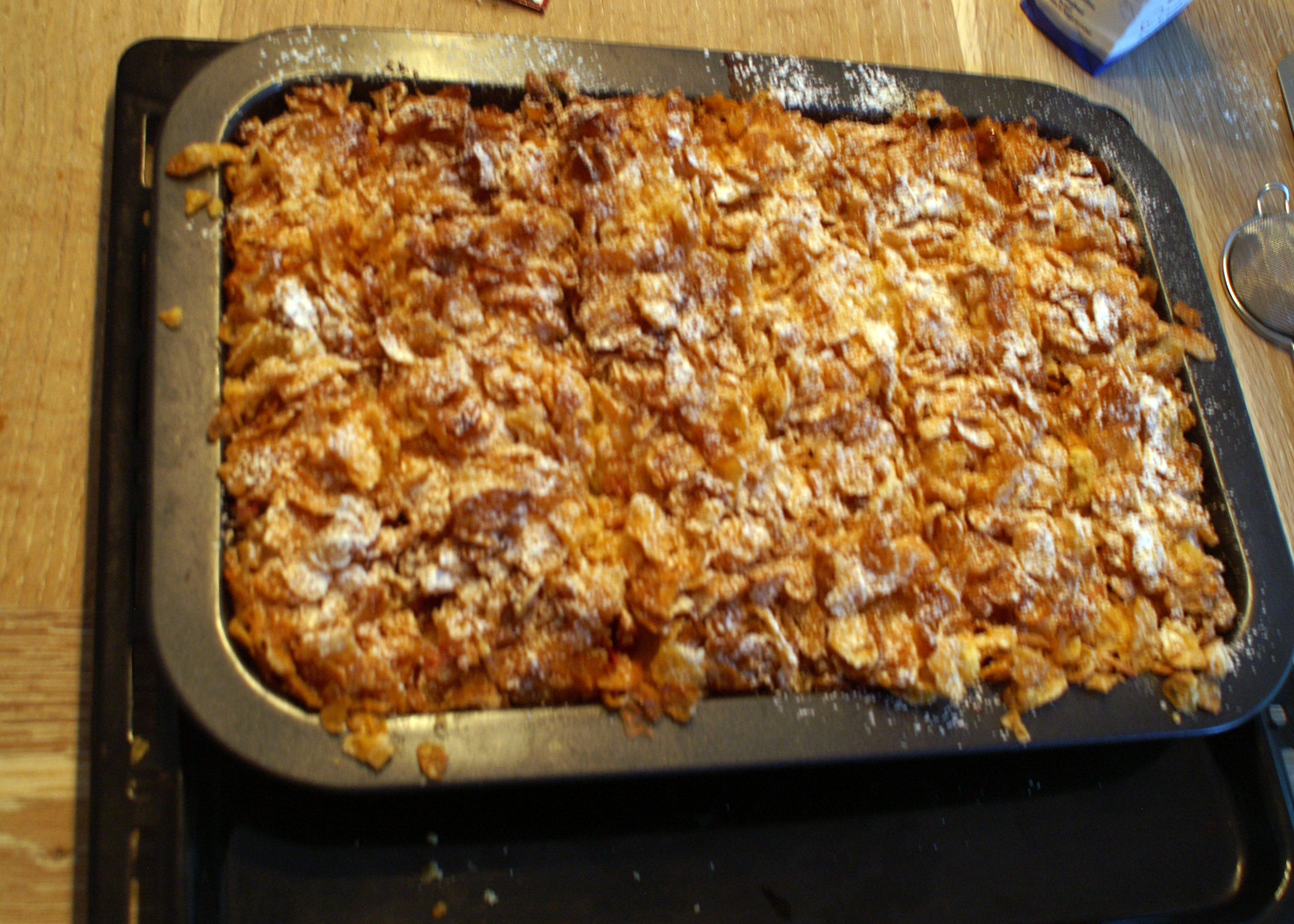 Wenn man ein süsses Dessert sucht, welches sich schnell zubereiten lässt, dann ist dieser Blechkuchen eine gute Wahl. Er ist ganz einfach und schnell zubereitet und gelingt deshalb ohne Probleme. Wenn man etwas mehr Zeit zur Verfügung hat und zusätzlich die Jahreszeit stimmt, kann man dem Kuchen mit frischen Kirschen einen noch besseren Geschmack verleihen. Bei Stress tuen es aber auch die Kirschen aus der Dose. Eine Köstlichkeit sind die Kuchenstücke so oder so. Der Kracher ist aber die Cornflakeskruste, die beim Verzehr einen guten Kontrast zum weichen Kuchen bietet und geschmacklich jeden überzeugt.