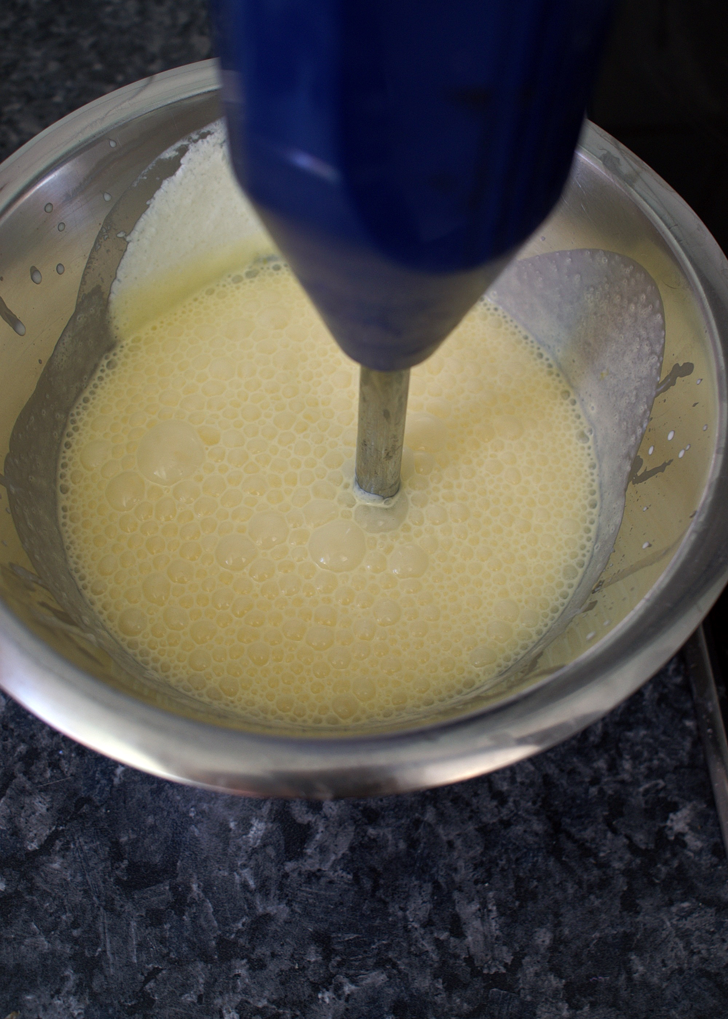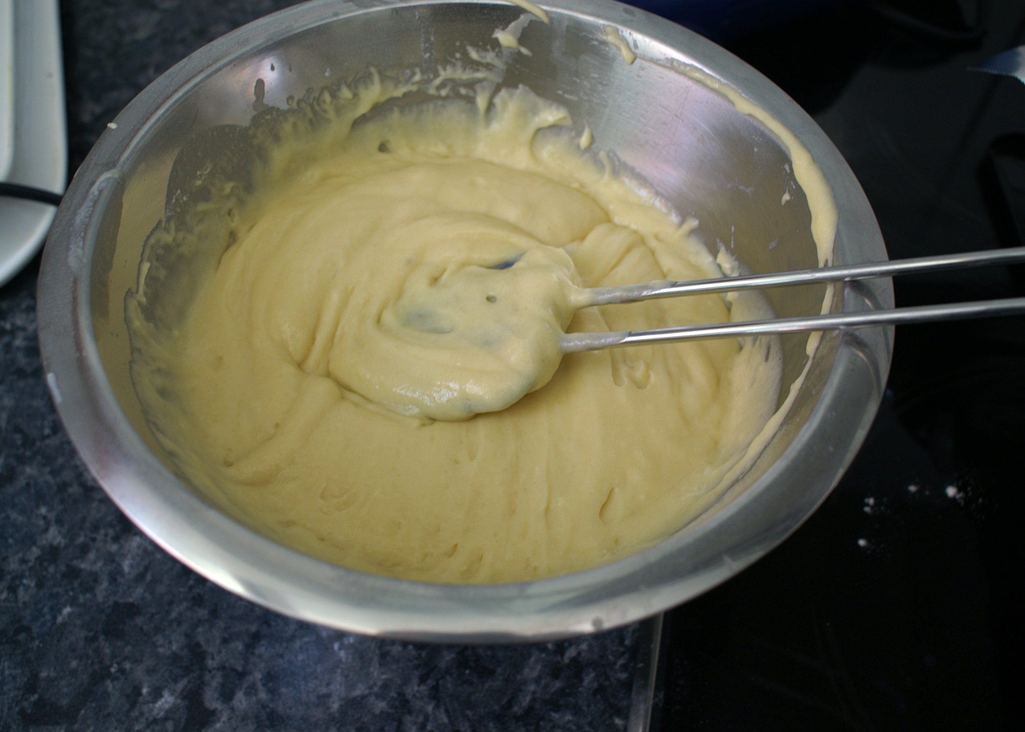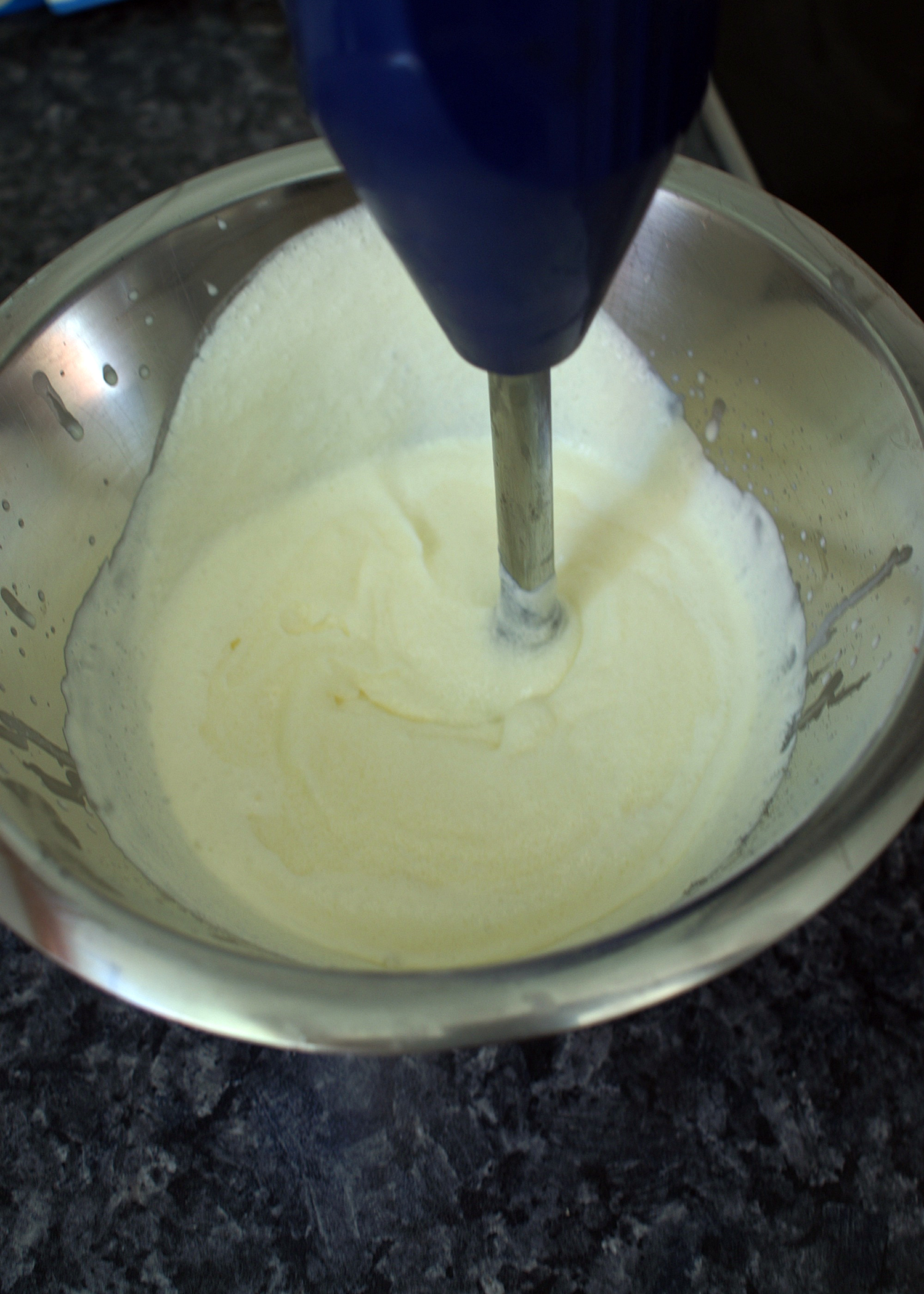 Den Rahm halbsteif schlagen und dabei Zucker mit einer Prise Salz einrieseln lassen. Dann die Eier einzeln unterrühren.