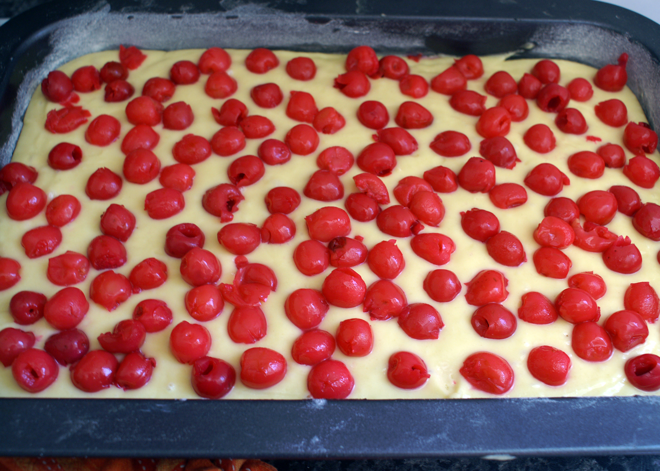 Das Ganze in die Form streichen und die Kirschen darauf verteilen. Nun für ca. 12 Minuten backen.