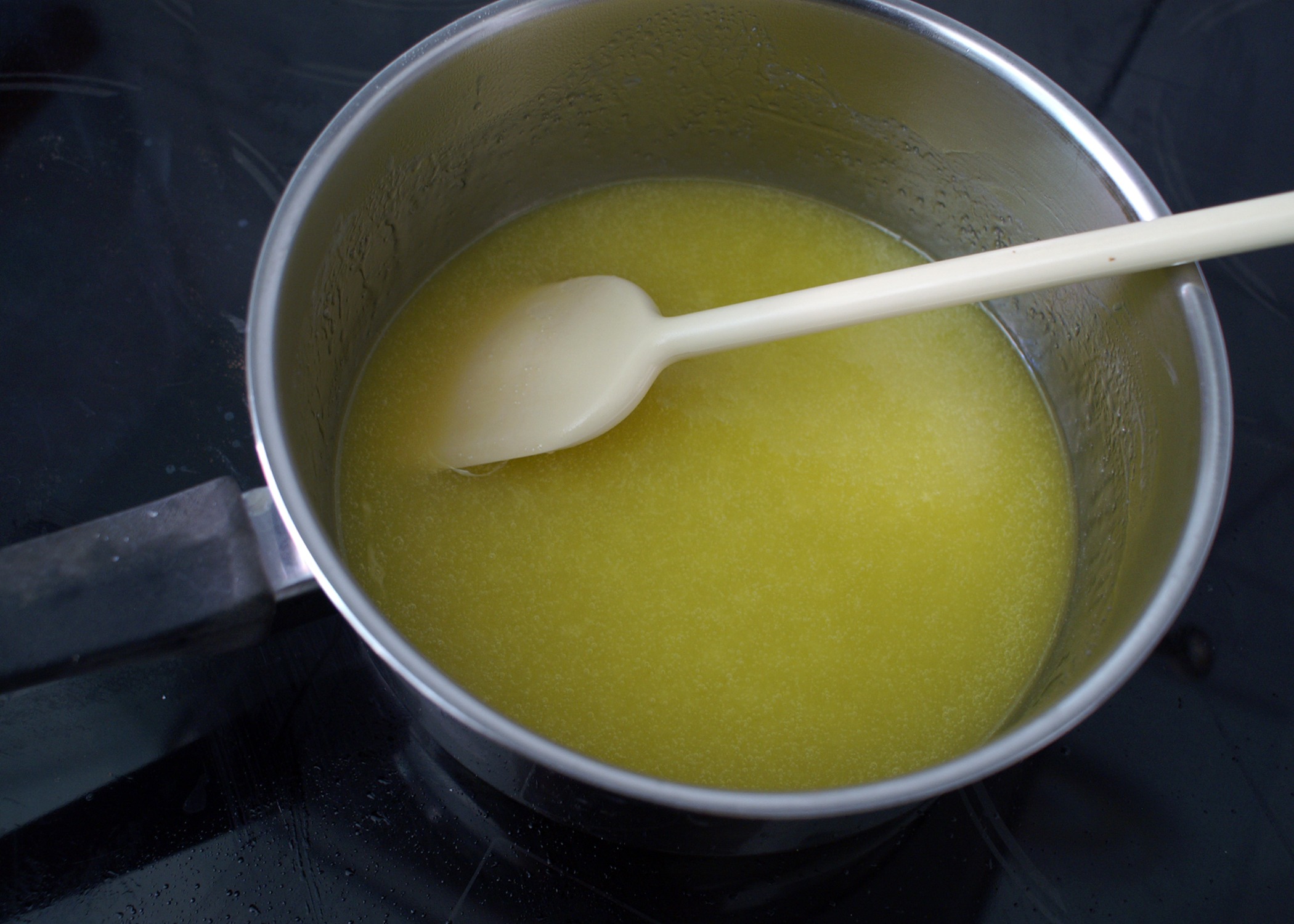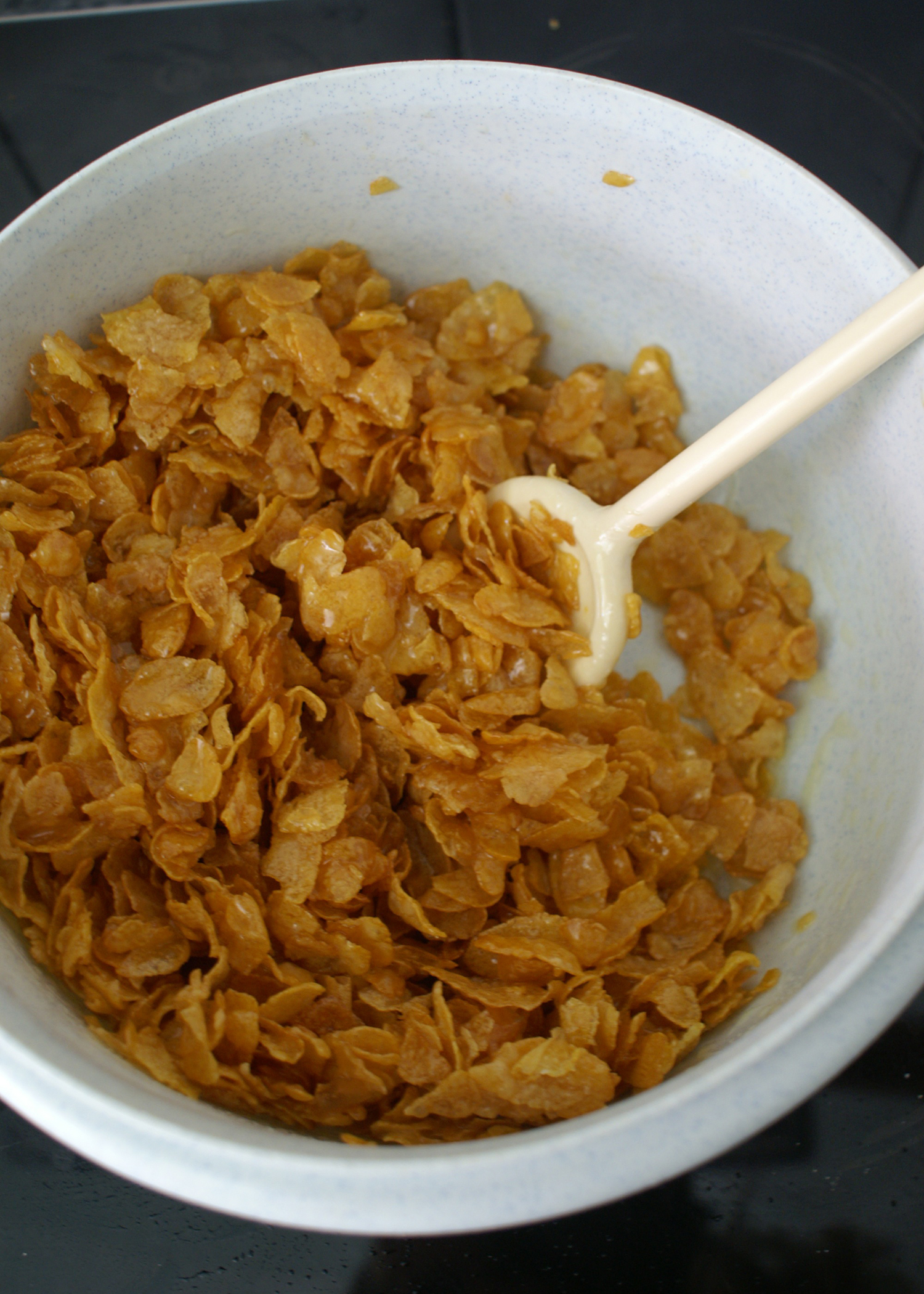 Inzwischen kann die Cornflakeskruste zubereitet werden. Dazu die Butter zusammen mit der Milch und dem Zucker in einer Pfanne aufkochen. Dann die Cornflakes dazugeben und alles gut Mischen.