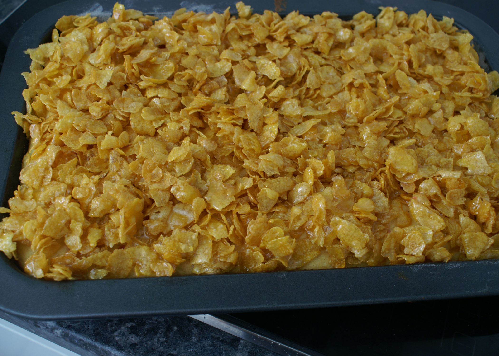 Nach 12 Minuten den Kuchen aus dem Ofen nehmen und die Cornflakeskruste darauf verteilen. Anschliessend im Ofen für 12 weitere Minuten bei gleicher Temperatur backen.