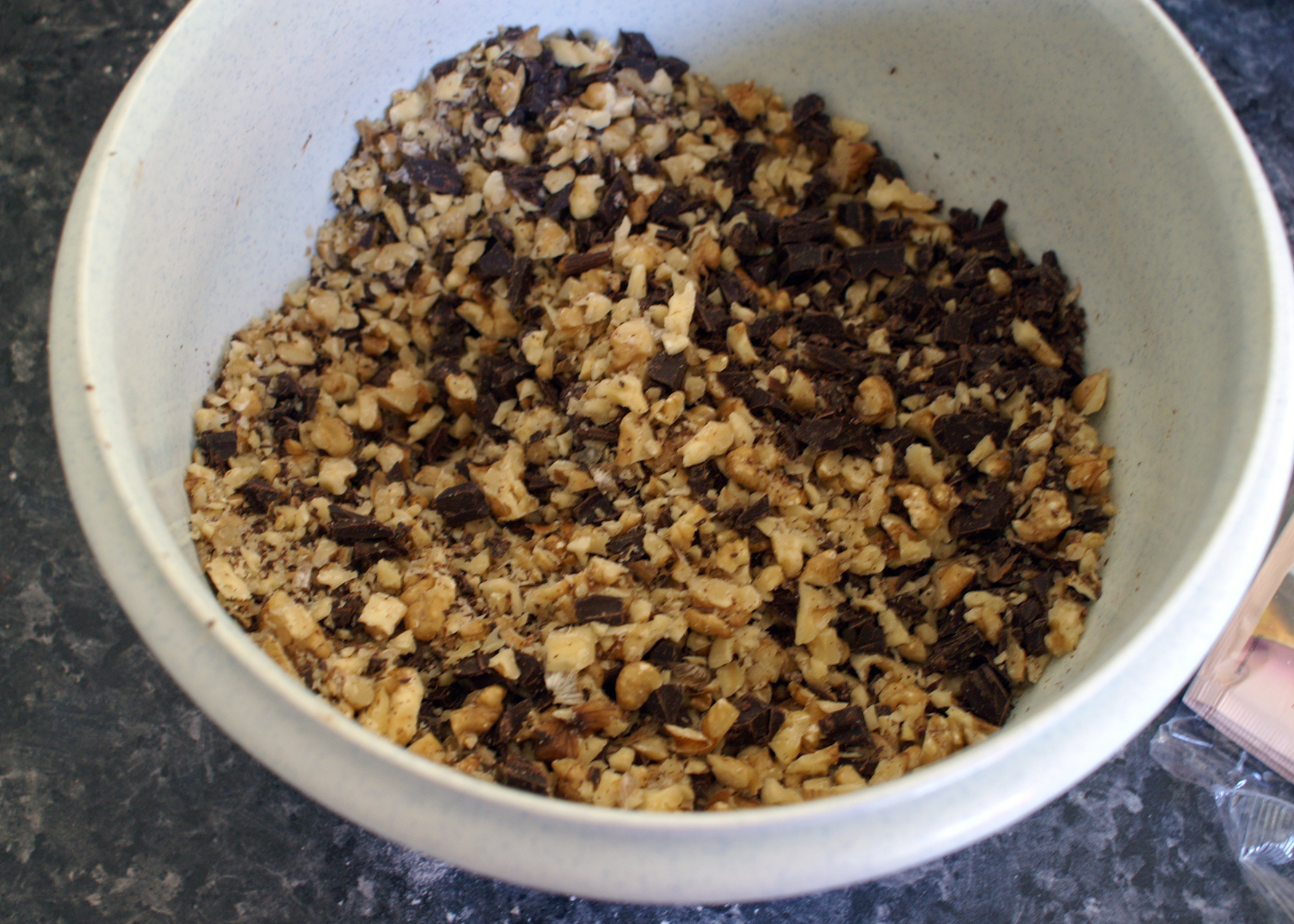 Jetzt die Walnüsse und die Schokolade grob hacken. Gleichzeitig die Butter schmelzen und etwas abkühlen lassen, so dass sie eine lauwarme Temperatur aufweist.