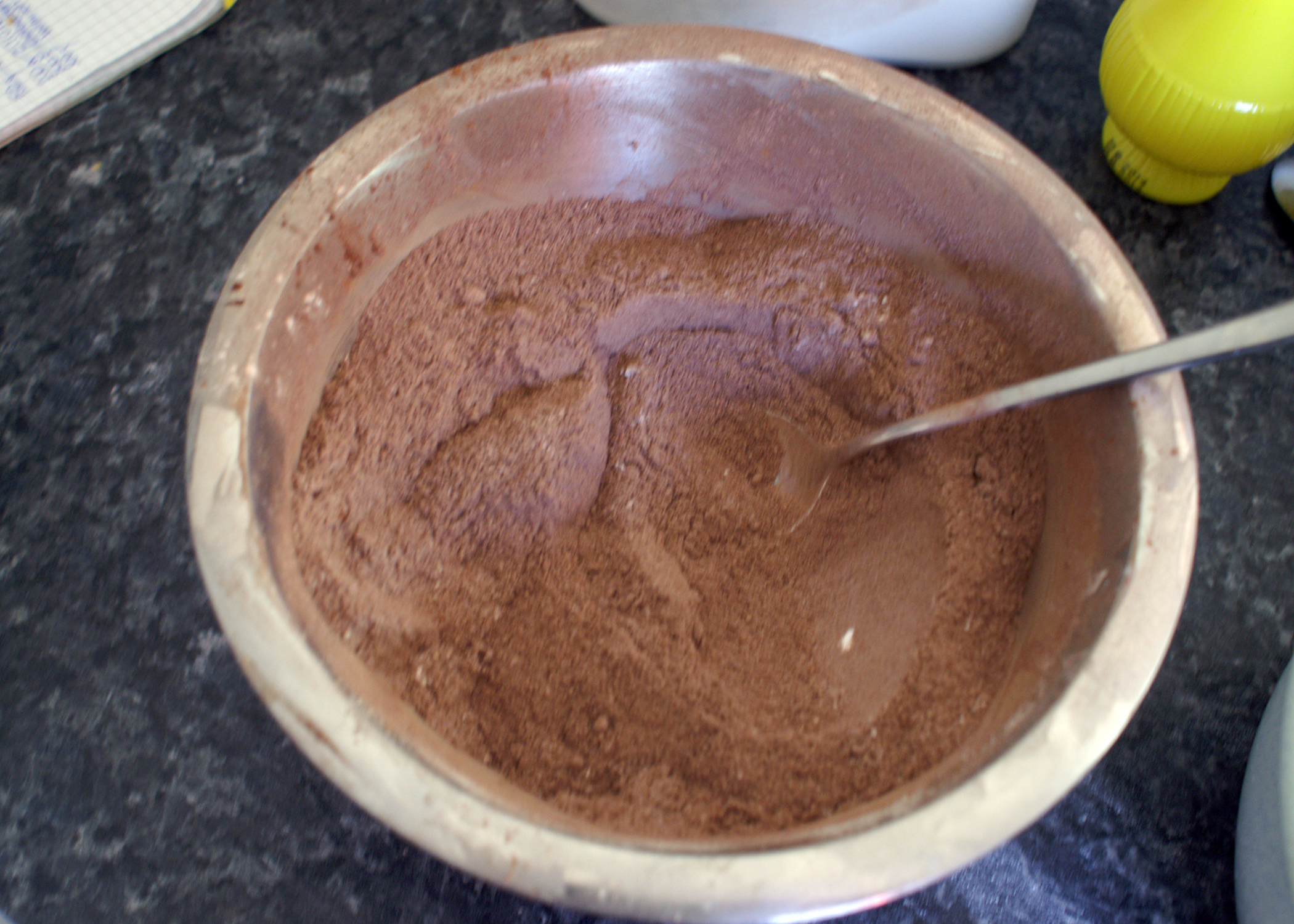 In einer grossen Schüssel Mehl, Kakao, Backpulver, brauner Zucker, Vanillezucker und Kaffeepulver mischen.