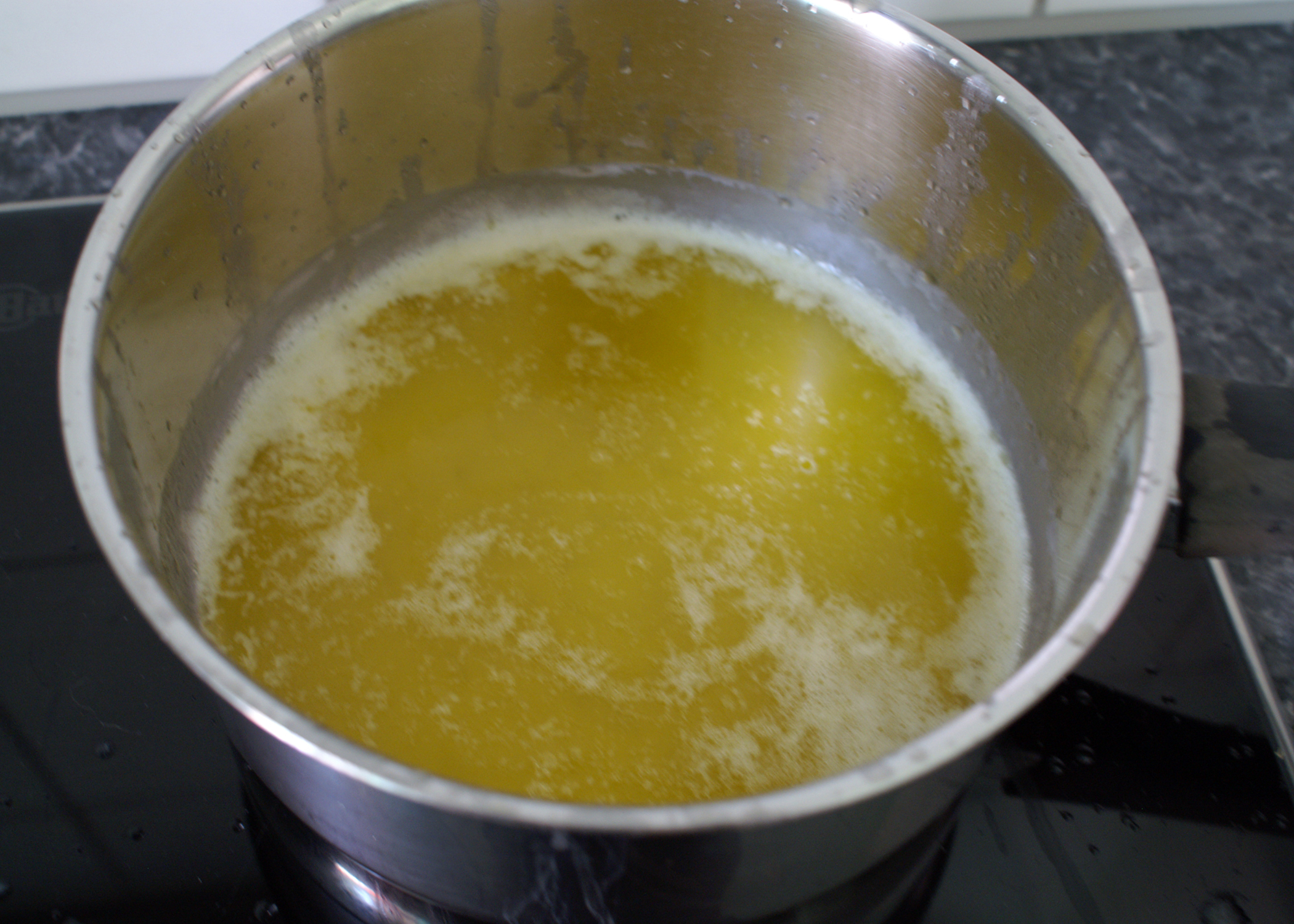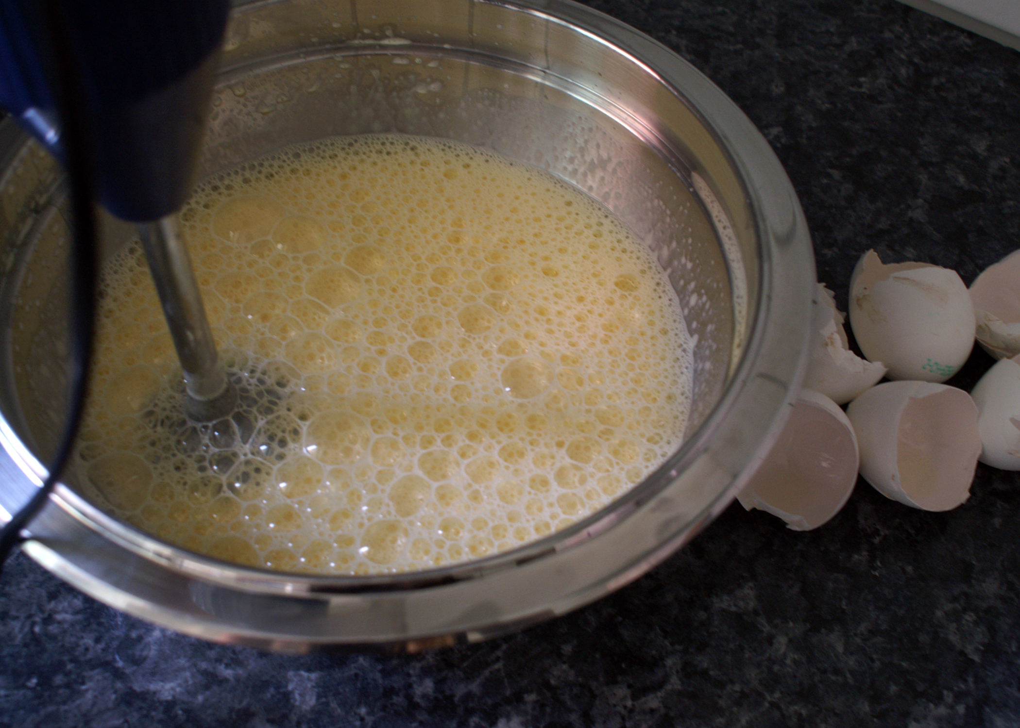 Nun die Eier in einer anderen Schüssel 5min schaumig schlagen. Dann die geschmolzene Butter unter weiterem Rühren dazugiessen.