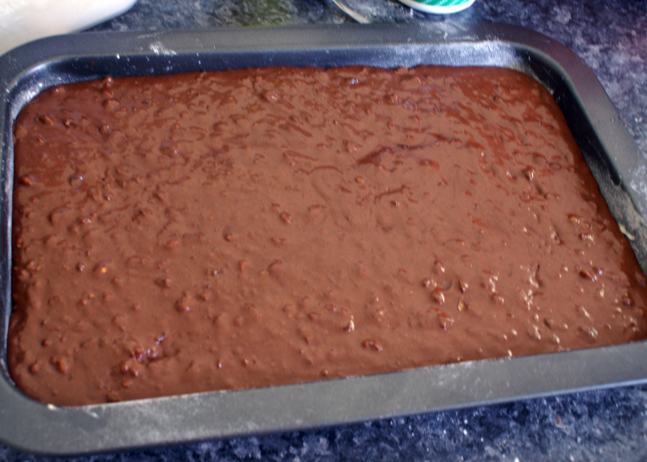Zum Schluss noch Crème fraîche, Schokolade und Nüsse darunterheben. Das Ganze in die Form geben und für ca. 30 Minuten backen. Wenn nach dieser Zeit noch Teig an einer Nadel kleben bleibt, einige Minuten nachbacken. Jedoch nicht zu lange, denn die Brownies sollen feucht sein! Nach dem Backen gut auskühlen lassen.