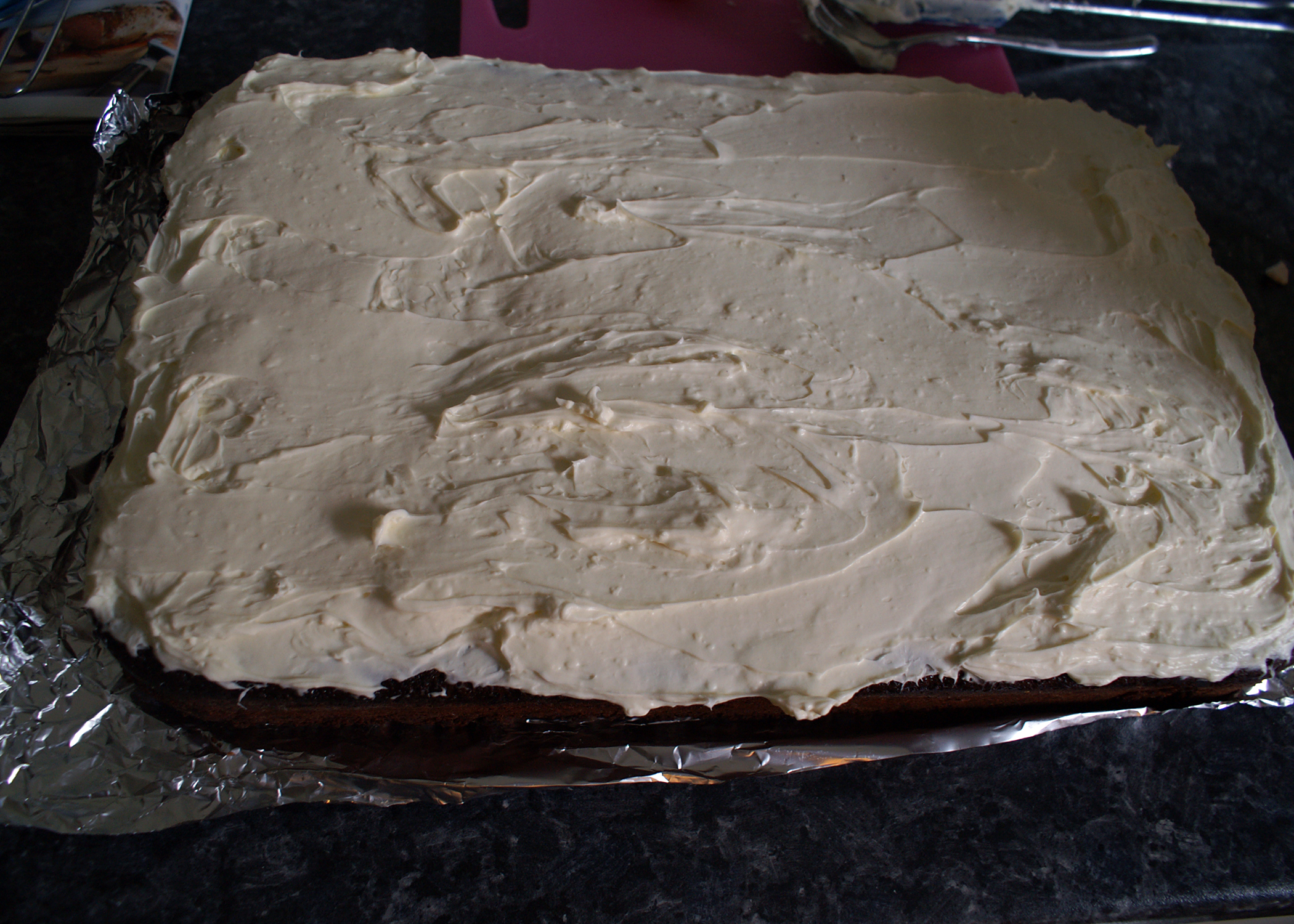 Für die Frischkäsemischung Mascarpone mit dem Puderzucker verrühren. Danach wellig auf den Kuchen streichen.