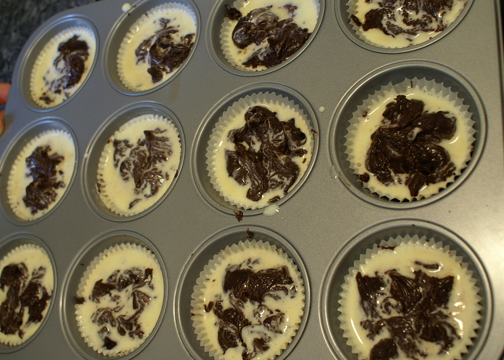 Als nächstes fast den gesamten Teig auf die Förmchen verteilen, ein wenig beiseite stellen. Nun die Cheesecakemasse daraufgeben (es ist normal dass diese sehr flüssig ist) und den restlichen Schokoteig verteilen.