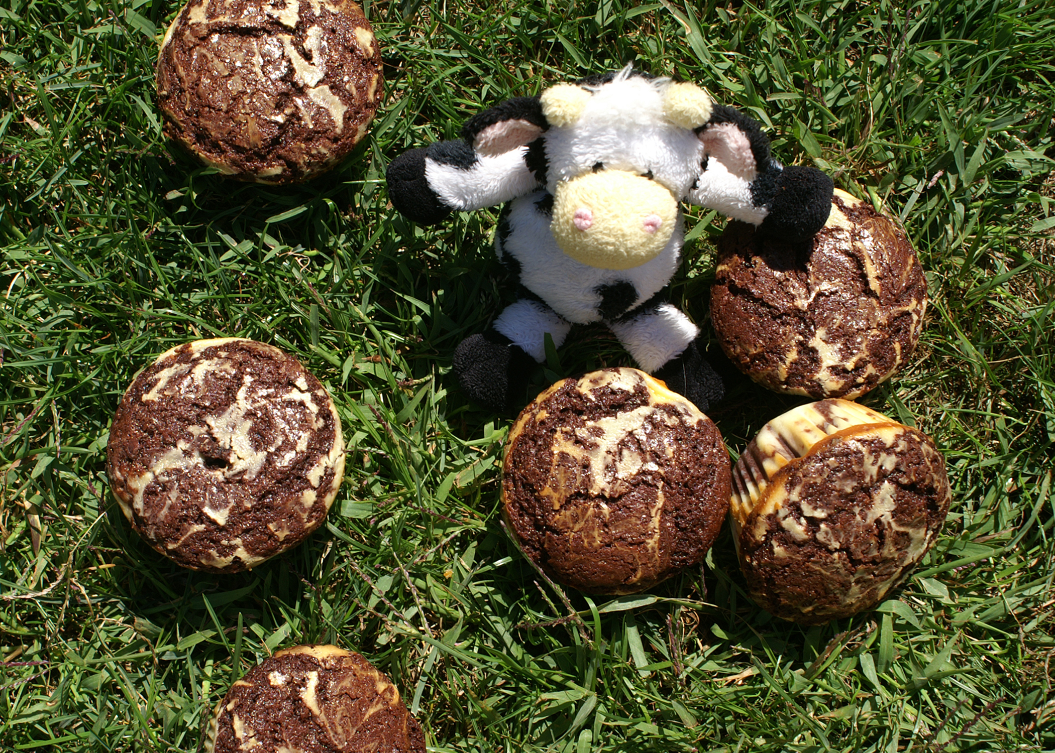 Eigentlich wollten wir ja ein „Red-Velvet Cupcakes“ Rezept ausprobieren. Das heisst, was auf dem Foto braun ist, hätte rot werden sollen. Darum findet ihr in den Zutaten auch rote Lebensmittelfarbe. Naja, entweder haben wir etwas falsch gemacht, oder die Lebensmittelfarbe war einfach zu schwach. Da uns die entstandenen Farben so an den guten alten Pudding von der Kuh „Paula“ aus Kinderzeiten erinnert haben, tauften wir die Cupcakes kurzerhand zu „Gefleckte Muffins“ um. Die dunkle Masse bietet die nötige Schokoration, während die helle Cheesecakemasse einen weichen Kontrast bietet. Obwohl sie also eigentlich missglückt sind, waren diese Muffins ein voller Erfolg!