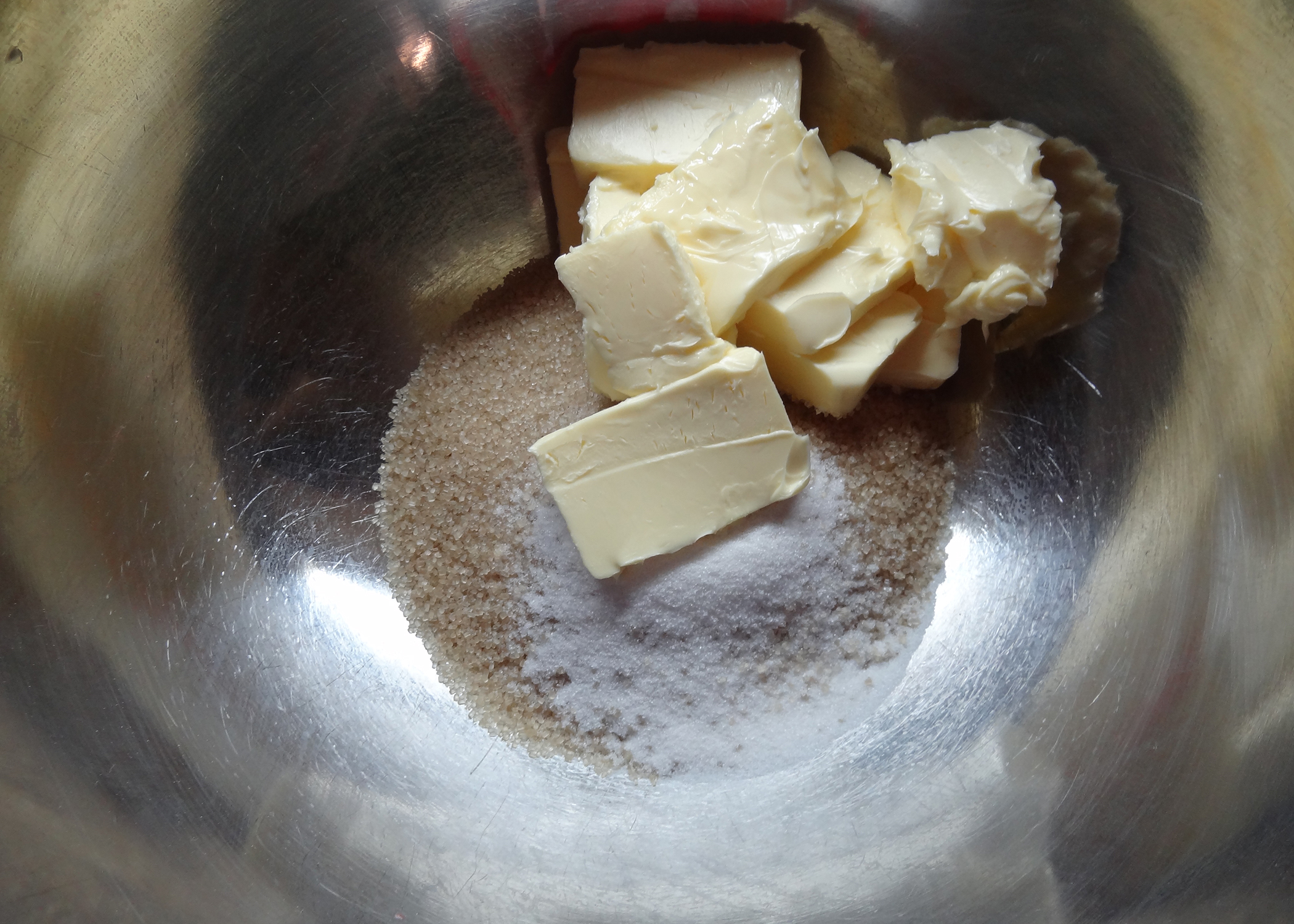 Zuerst wird der Cookie Teig hergestellt. Dazu Butter, Vanillezucker und brauner Zucker in einer Schüssel cremig rühren.