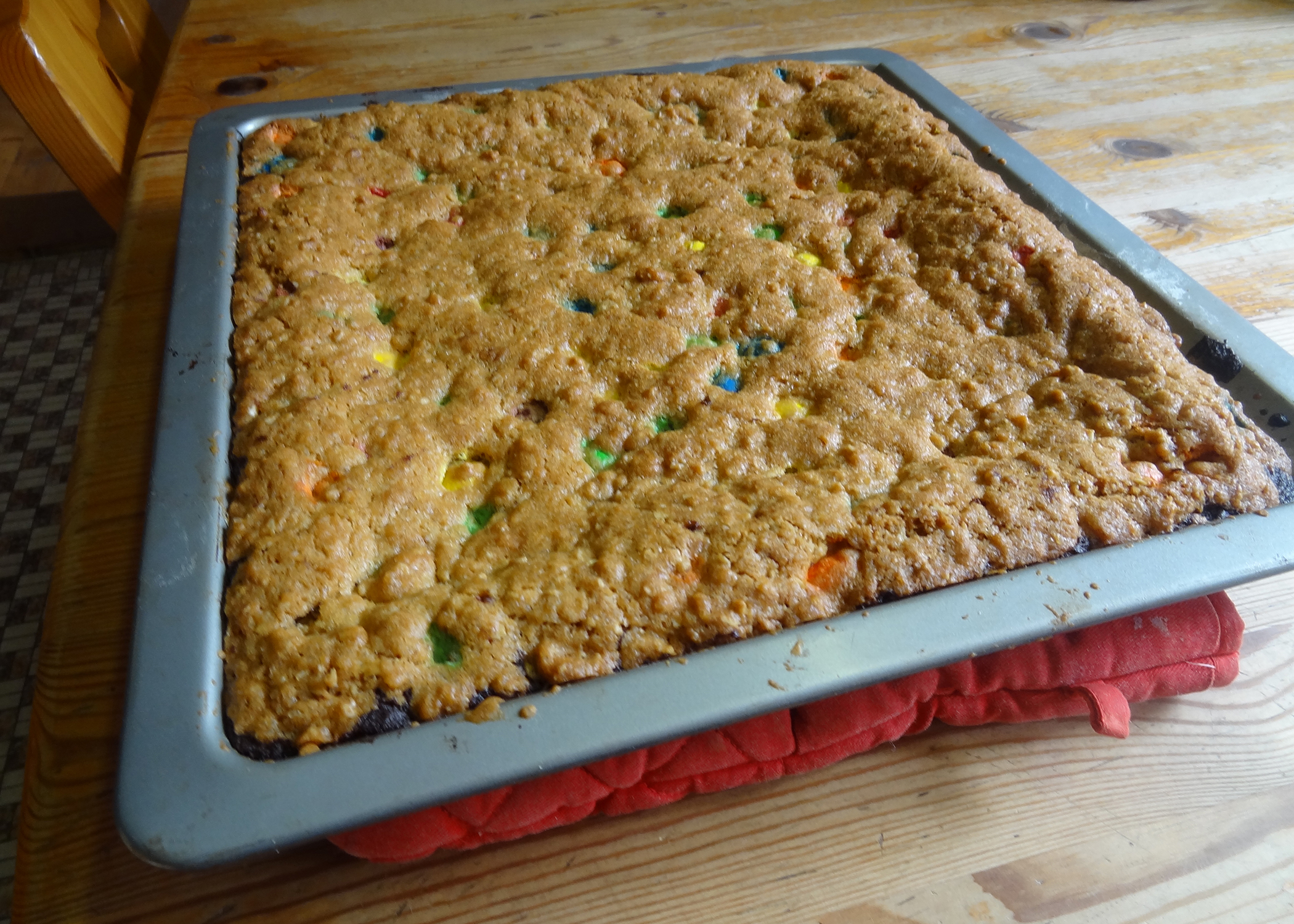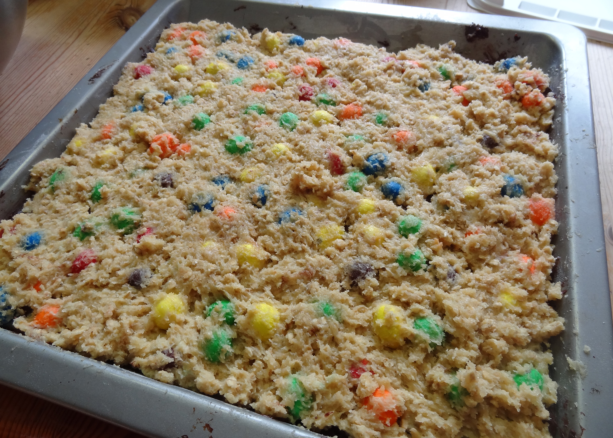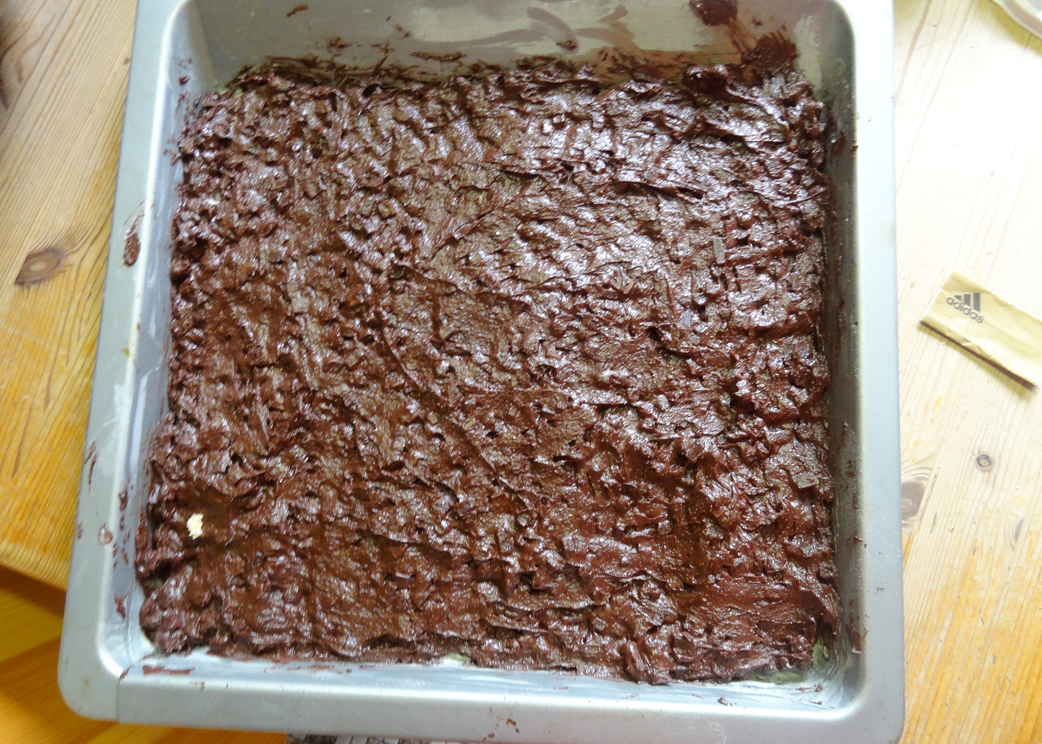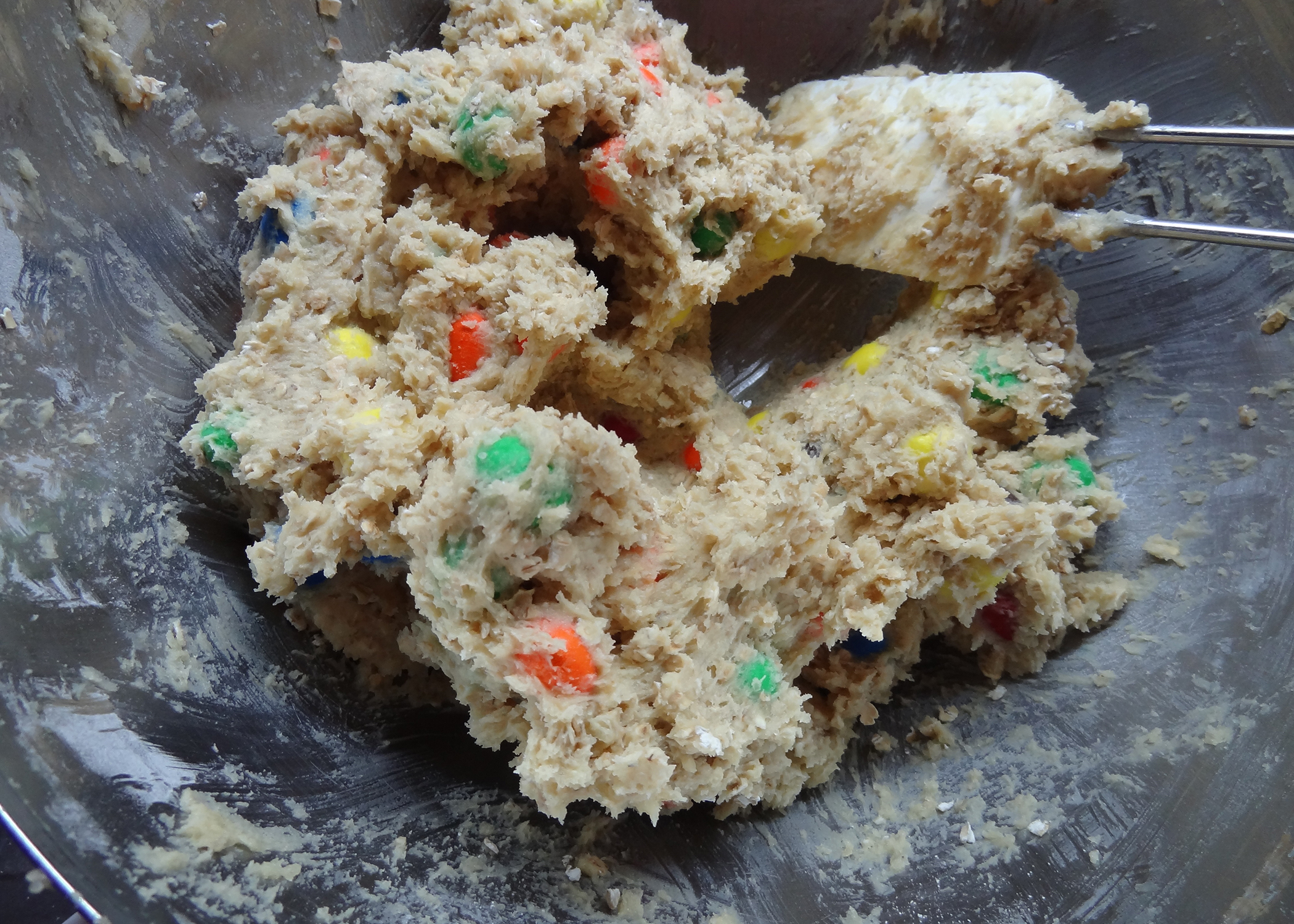 Anschliessend Eier nacheinander unterrühren. Mehl, Natron, Salz und Backpulver vermischen und nach und nach dazurühren. Zum Schluss die Haferflocken und M&M’s hinzufügen und verrühren. Während der Brownie Teig zubereitet wird in den Kühlschrank stellen.