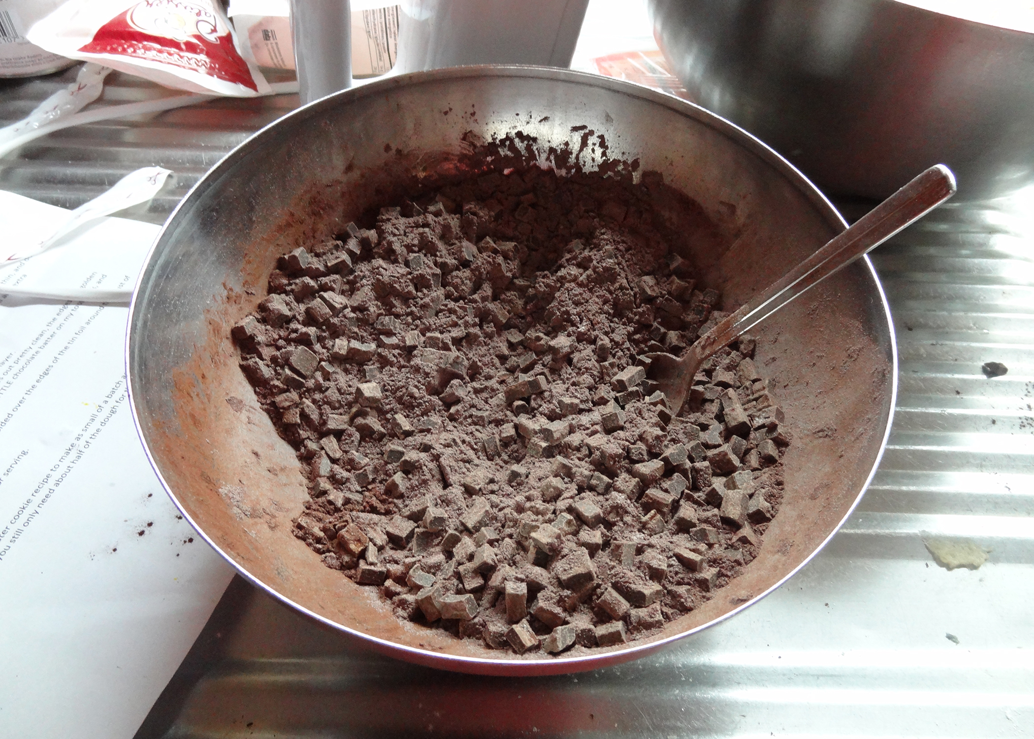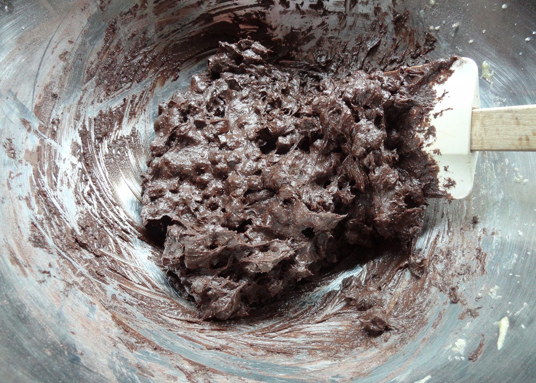 Mehl, Kakaopulver, Salz und Schokoladenwürfel vermischen und mit der Eimasse gut verrühren, sodass ein zäher Teig entsteht.