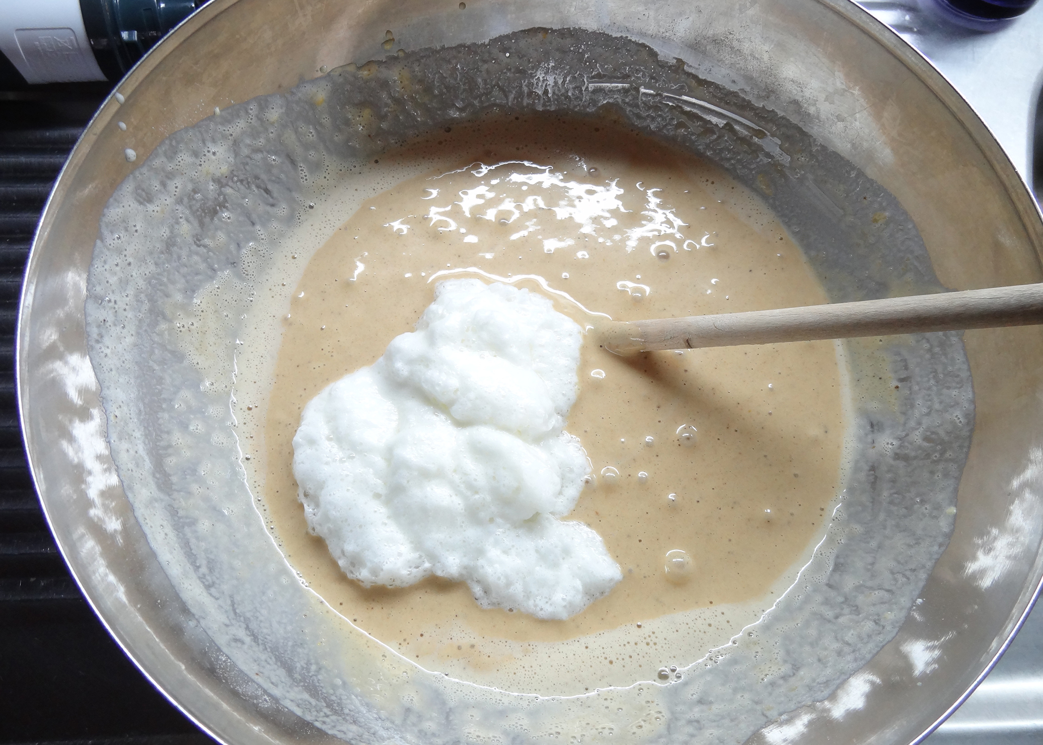 Eiweiss in zwei Portionen mit je einer Prise Salz steifschlagen, auf die Masse geben und mit dem Teigschaber unterheben.