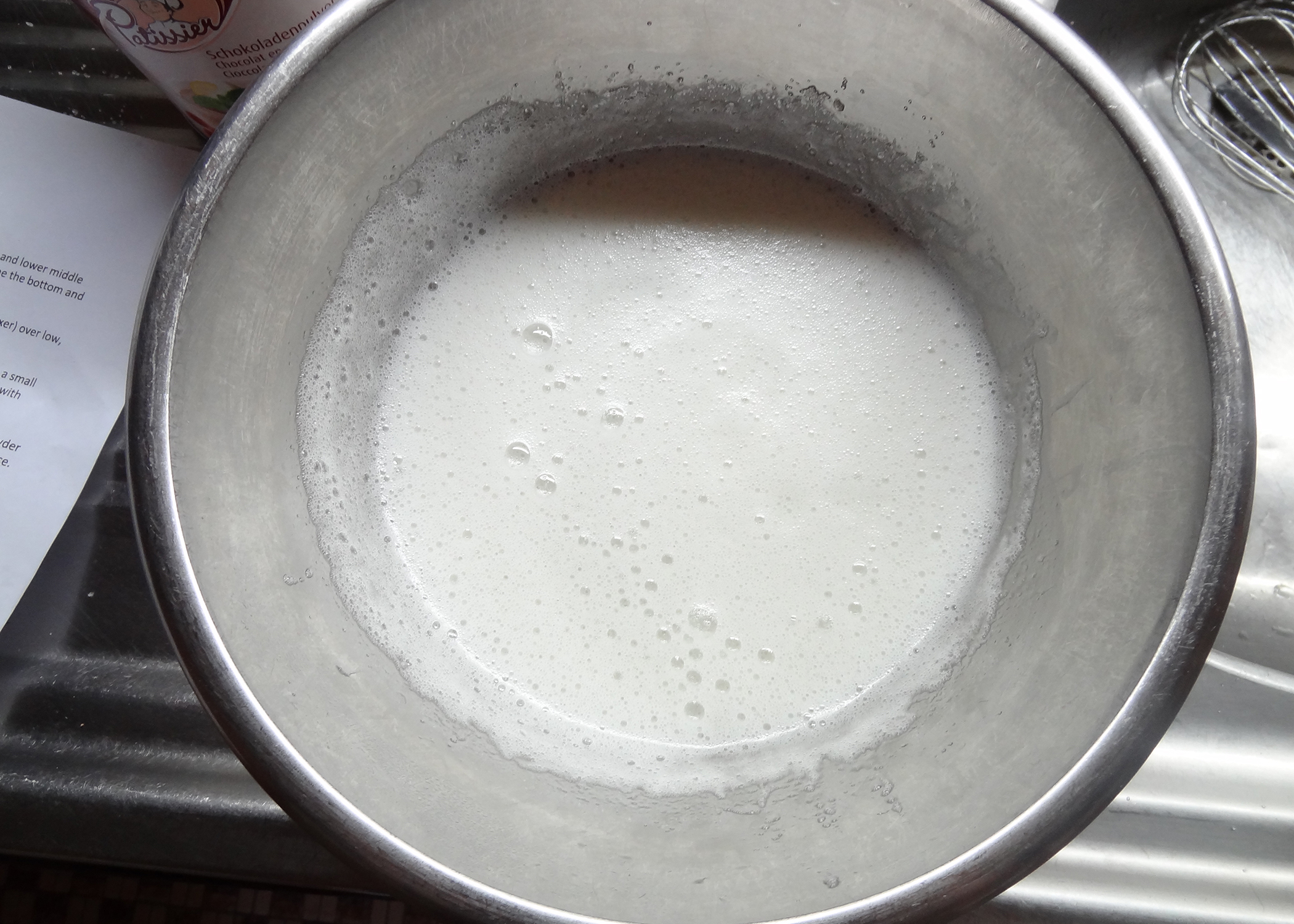 Zuerst Eiweiss und Zucker in eine Schüssel geben und während 4 Minuten in einem heissen Wasserbad mit dem Schwingbesen verrühren. Der Zucker soll sich dabei auflösen und die Masse soll schön schaumig werden.