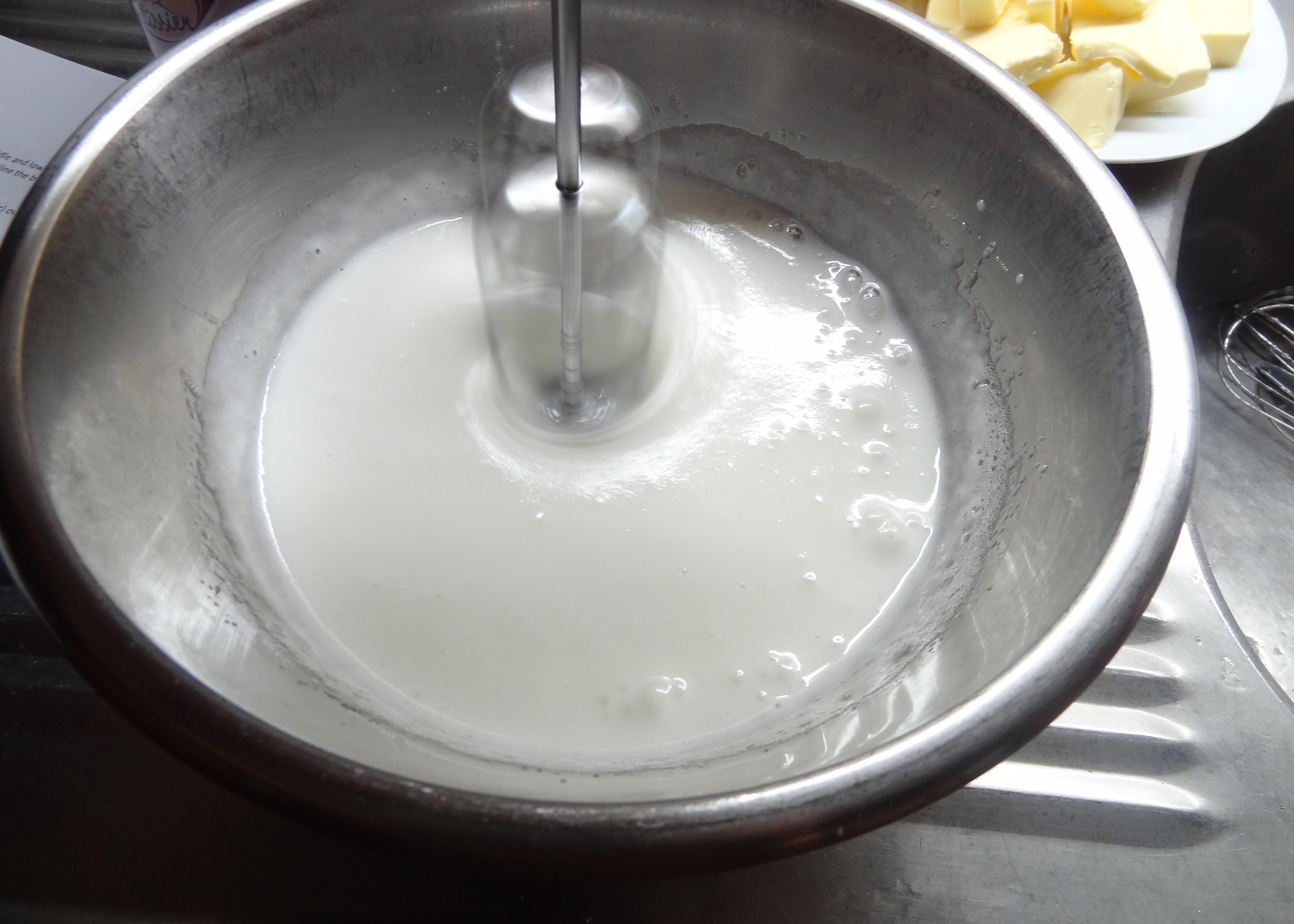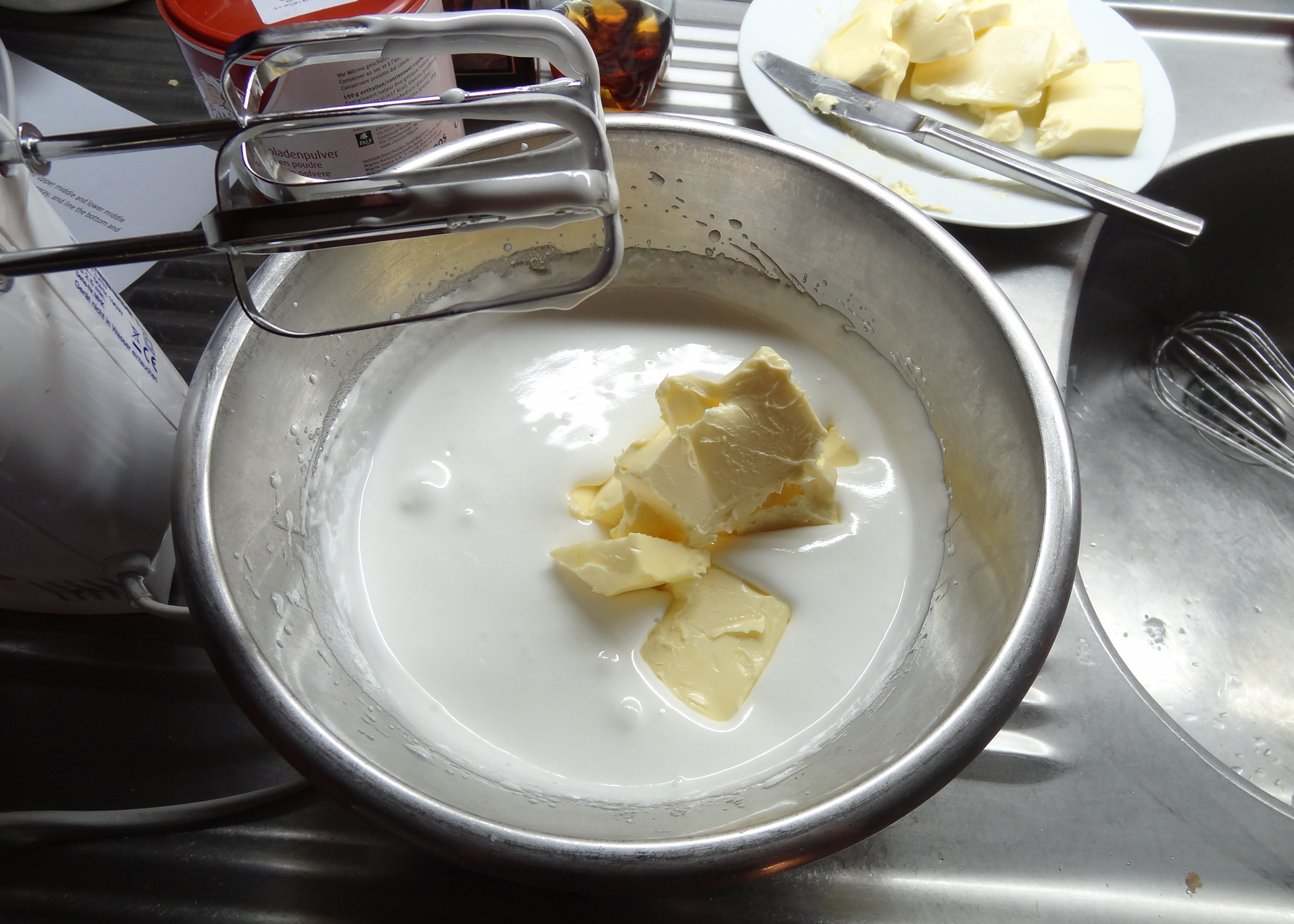 Anschliessend die Schüssel vom Wasserbad nehmen und mit einem Mixer für weitere 5 Minuten auf mittlerer Stufe schlagen. Dann die Butter nach und nach hinzufügen und für weitere 10 Minuten rühren. (Die Zeitangaben unbedingt einhalten, sonst klappts nicht)