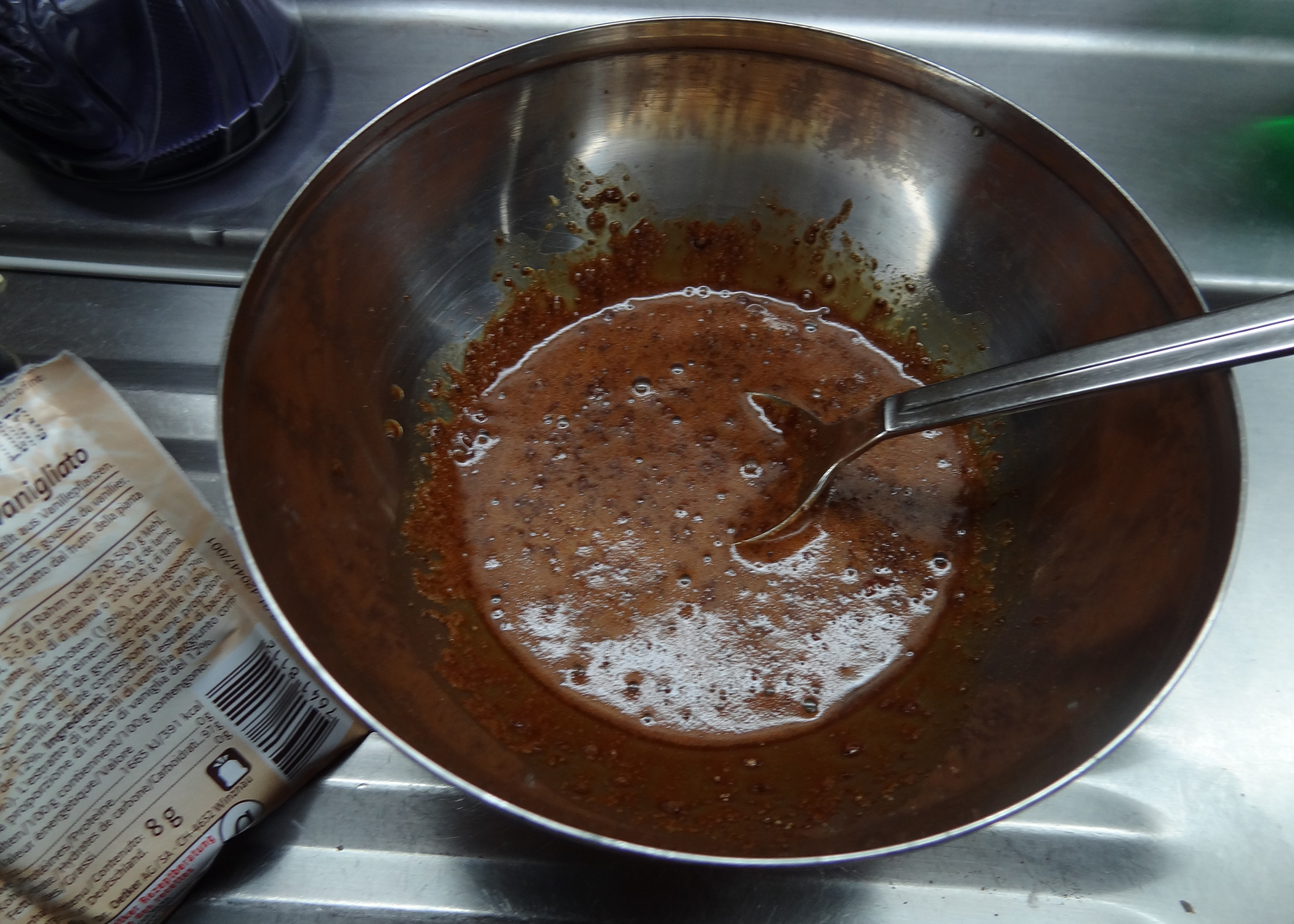 Espressopulver und Kakaopulver mit dem Wasser und Vanilleextrakt vermischen und unter die Eimischung rühren.