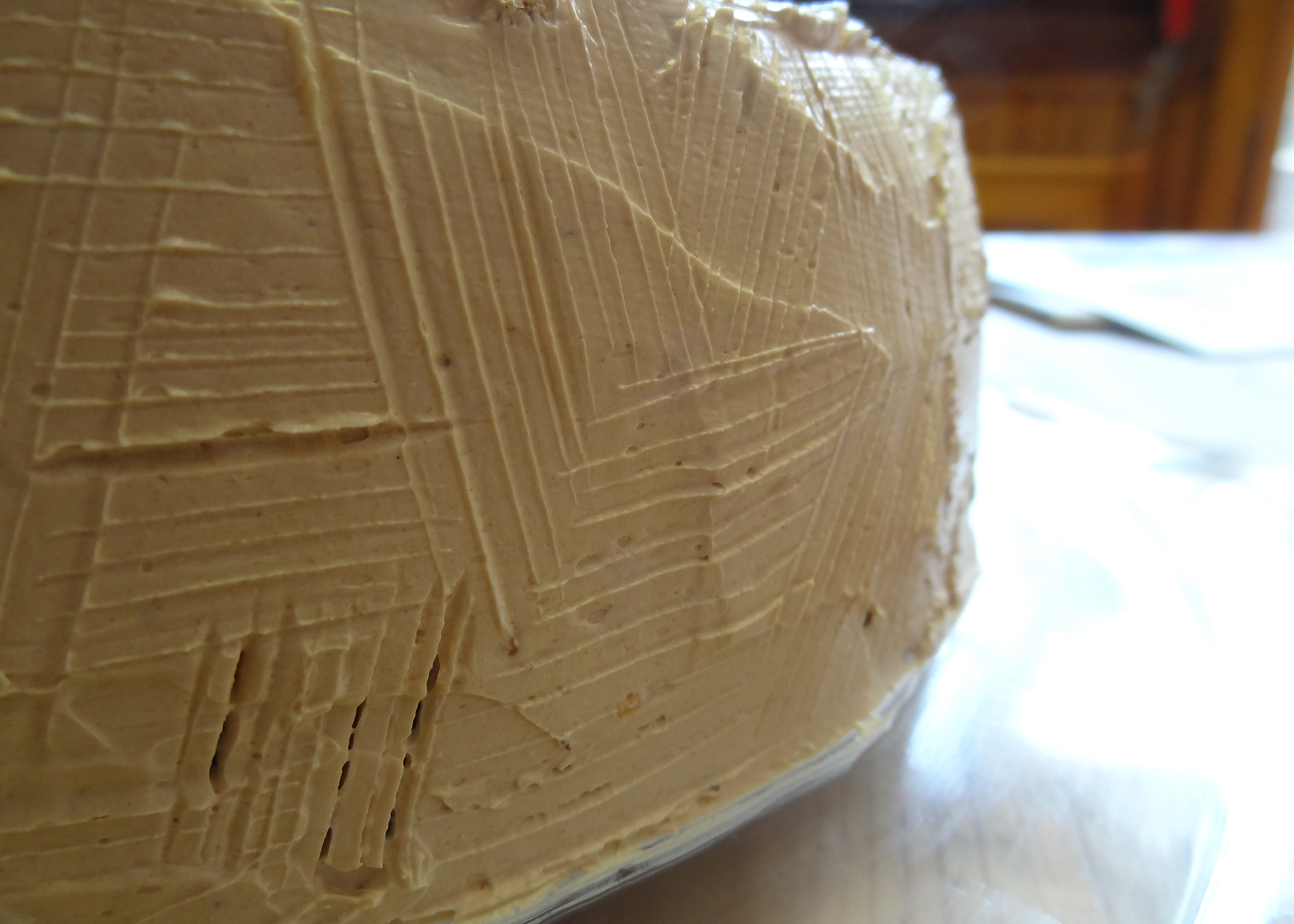 Das Biskuit einmal waagrecht durchschneiden, den Boden auf einen Tortenplatte setzen und mit einer dünnen Schicht Buttercreme bestreichen. Den Deckel aufsetzen und den Kuchen rundherum mit Buttercreme bestreichen. Wenn man lieber wenig Buttercreme hat, nicht die gesamte Masse aufbrauchen. Alles schön glattstreichen und nach Belieben mit einem Tortenspachtel ein Muster auf der gesamten Torte kreieren.