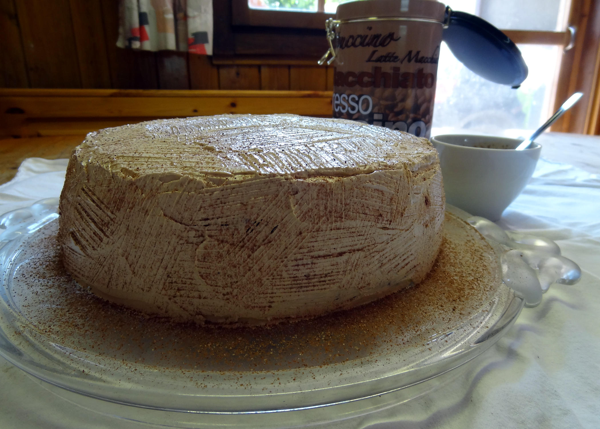 Vor Kurzem hat sich ein Bekannter eine Torte zum Geburtstag gewünscht, welche nach Kaffee oder Mokka schmeckt. Dazu haben wir ein tolles Rezept gefunden, welches wir noch etwas abgeändert haben. Das Biskuit ist luftig und feucht und der Kaffeegeschmack ist nicht zu intensiv, sodass sich auch weniger grosse Kaffeefans an einem Stück erfreuen können. Die Füllung/Überzug wird aus Eiweiss und Butter hergestellt und nur sparsam aufgetragen, damit die Torte nicht zu schwer und mastig wird. Das Geburtstagskind war zufrieden, die Gäste ebenso, und die Bäckerinnen auch.