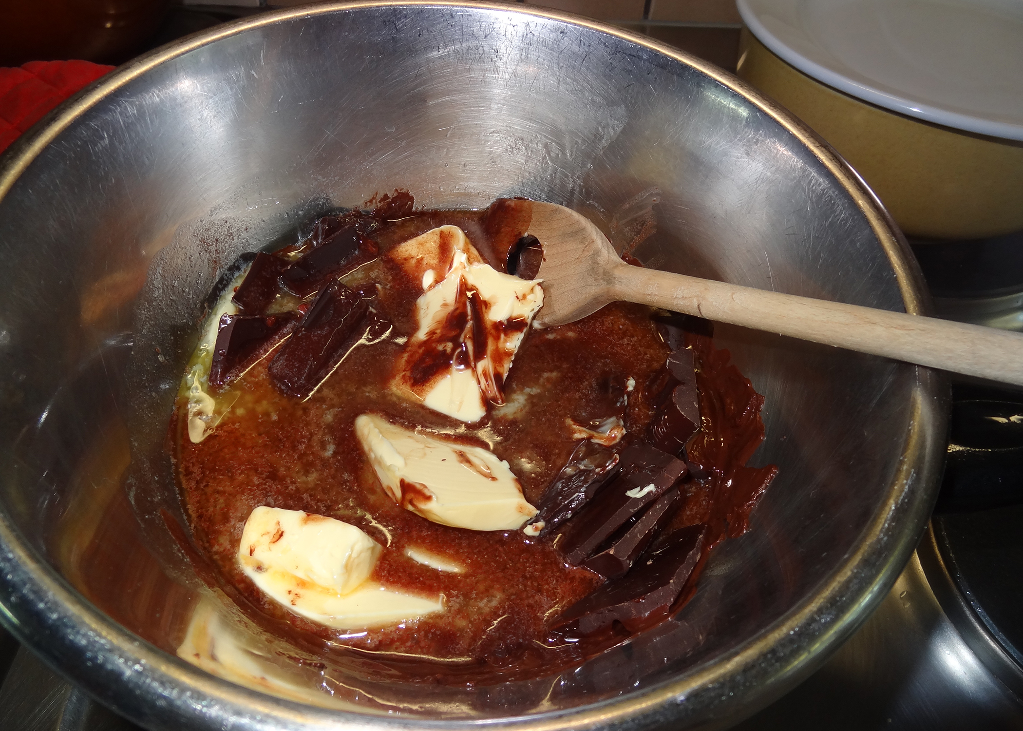Die Schokolade hacken und gemeinsam mit der Butter im Wasserbad schmelzen. Die Schüssel von der Hitze nehmen und etwas auskühlen lassen während der nächste Schritt durchgeführt wird. Dazu Eier, Eigelb und Zucker gut verrühren, sodass die Masse schön schaumig ist.