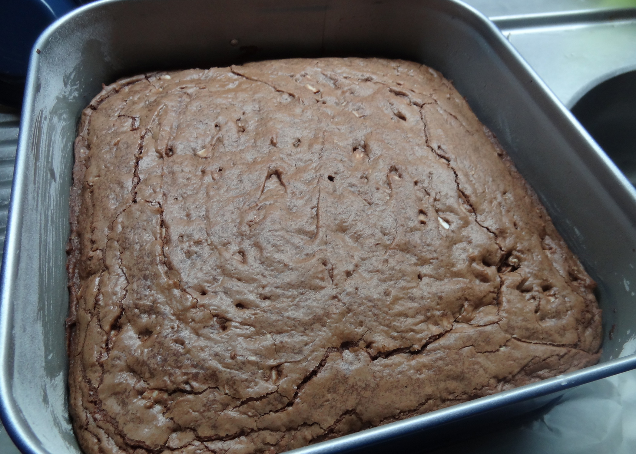 Mehl, Backpulver und Salz vermischen, auf die Masse sieben und von Hand unterheben. Zum Schluss die gehackten Mandeln unterrühren und den Teig in die vorbereitete Form füllen, falls nötig gleichmässig verstreichen und für maximal 20 Minuten im Ofen backen. Die Brownies sollen innen noch feucht sein, Stäbchenprobe bringt hier also nichts.