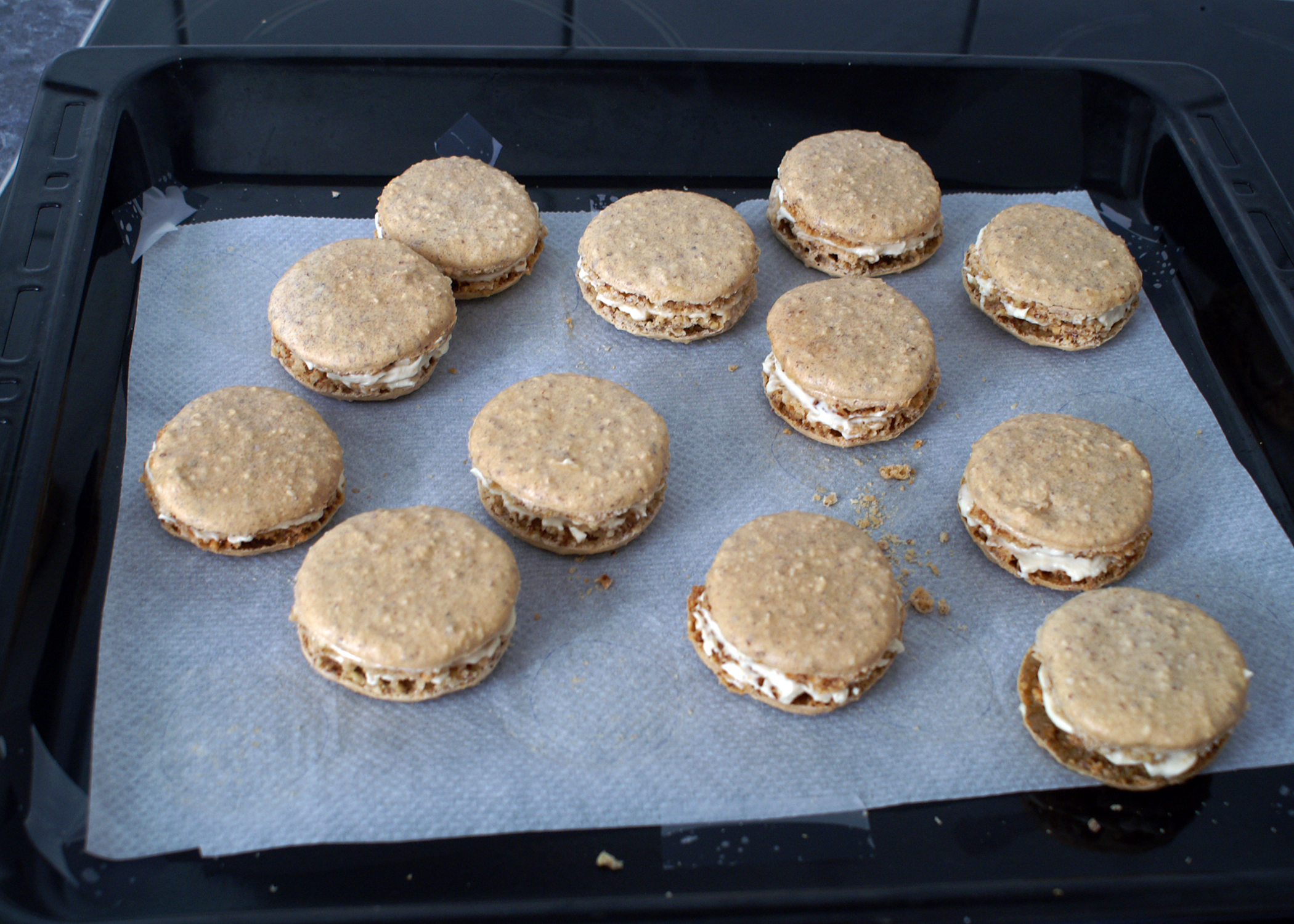 Wenn die Macarons fertig ausgekühlt sind, kann man sie paarweise mit der Füllung zusammenkleben.