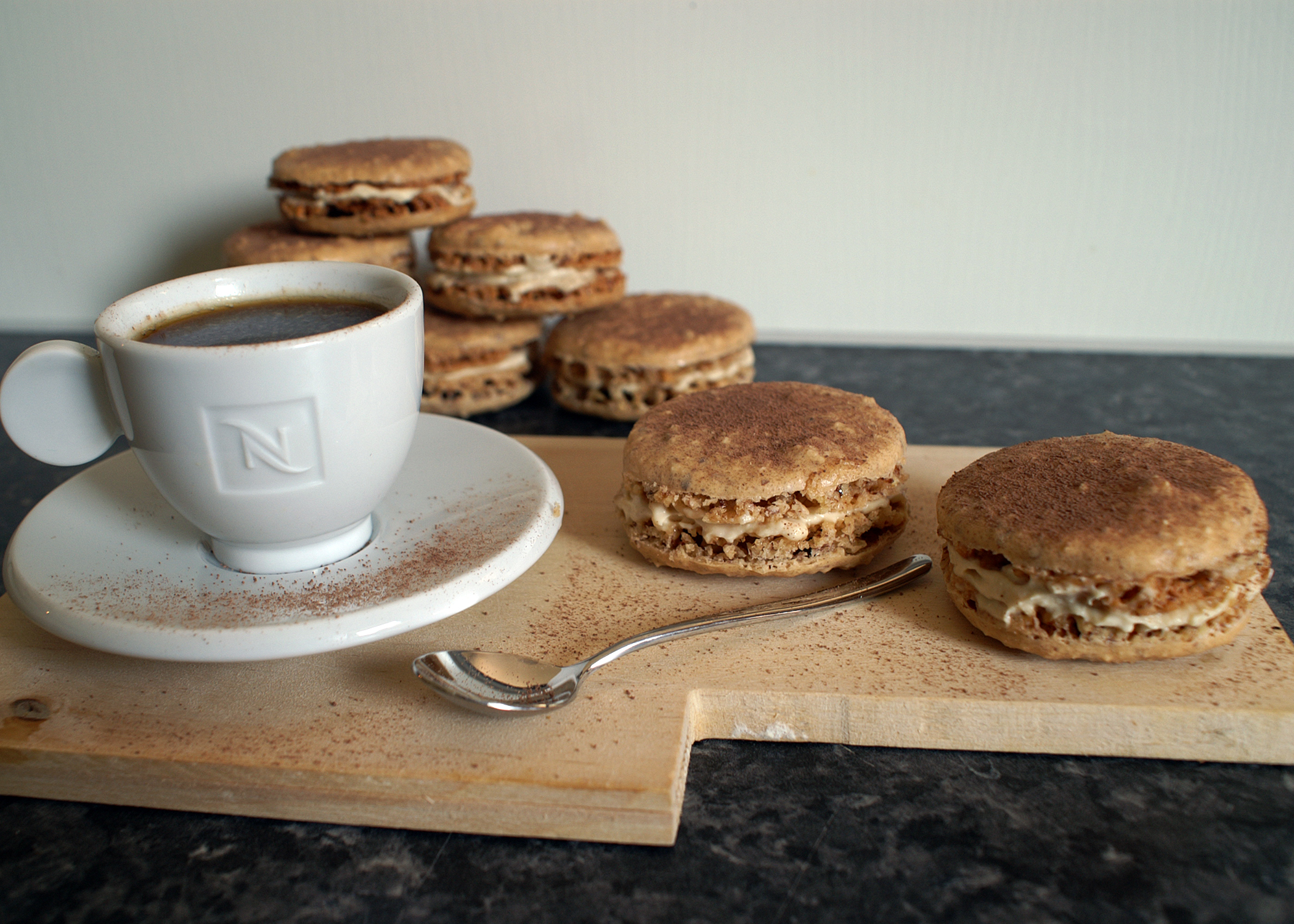 Zu Begin zwei Backbleche mit Backpapier auslegen. Nun mit einem Bleistift auf jedes Backpapier je 12 Kreise mit einem Durchmesser von 4cm malen. Unbedingt genügend Abstand zwischen den einzelnen Kreisen lassen! Bereits ein Espresso zubereiten und auskühlen lassen.