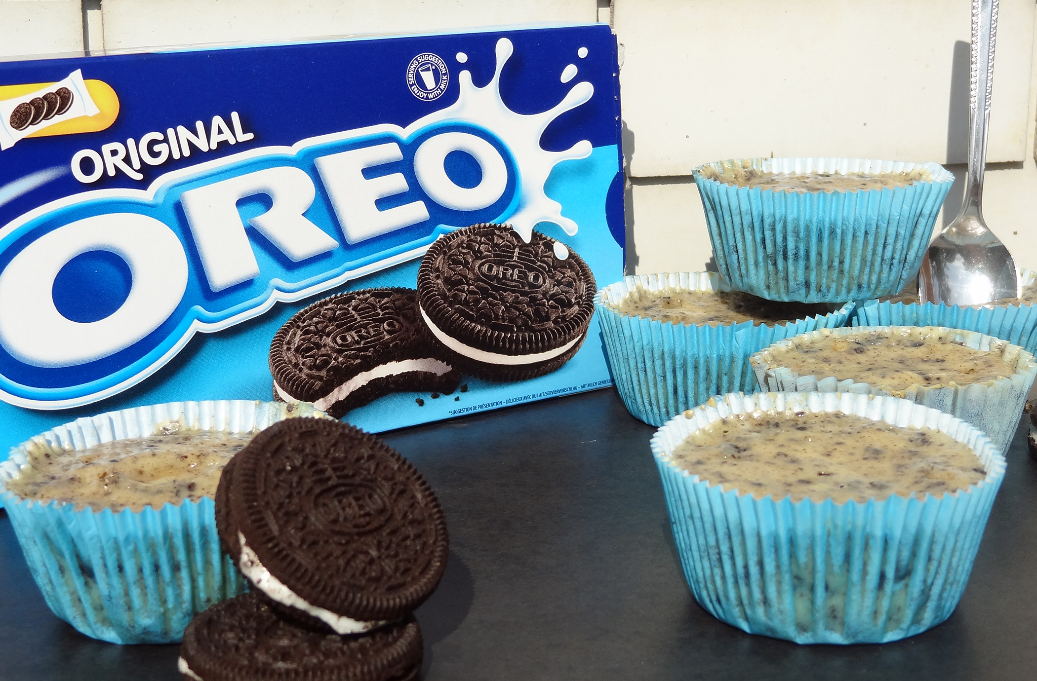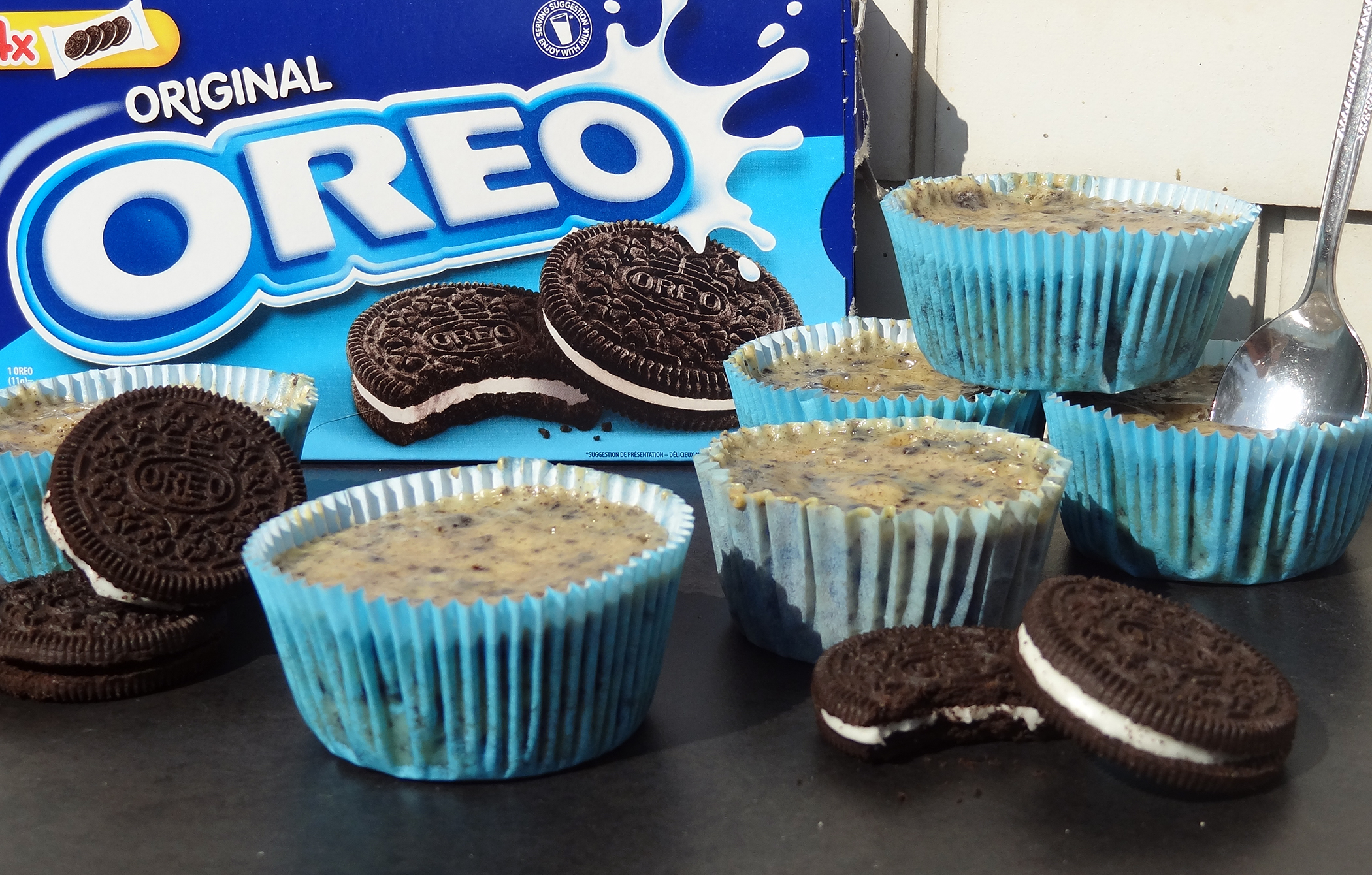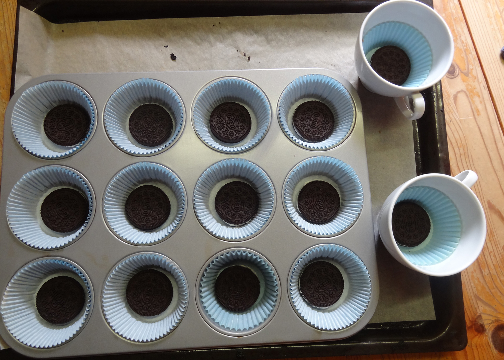 Als erstes ein Muffinblech mit Papierförmchen auslegen und 13 Oreokekse auf die Förmchen verteilen. Anstelle von einem Muffinblech, können auch kleine Tassen verwendet werden. Den Backofen auf 135°C Umluft vorheizen.