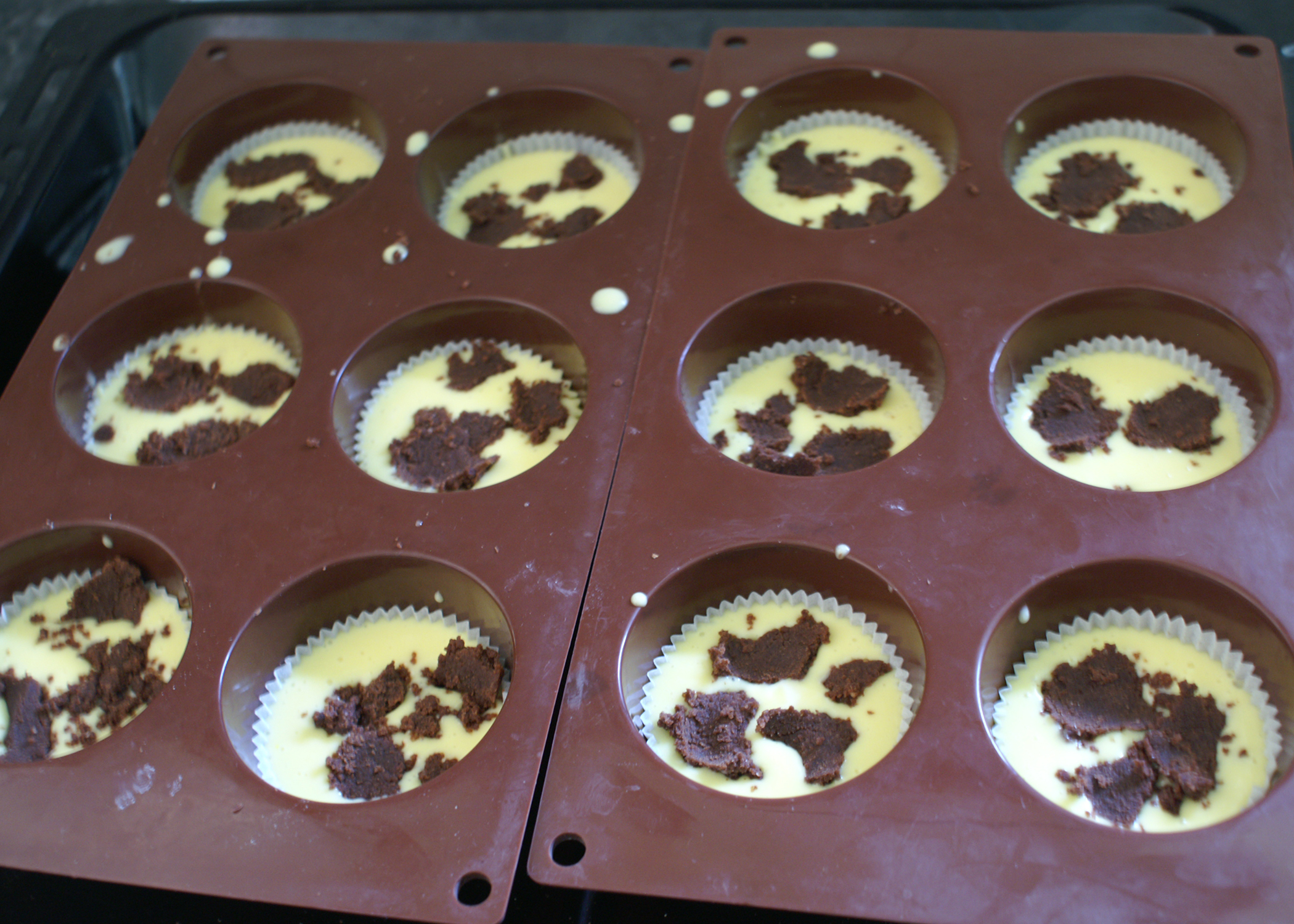 Jetzt wird der Restliche Kakaoteig verwendet. Aus diesem kleine Stückchen kneten und anschliessend auf die Muffins verteilen.