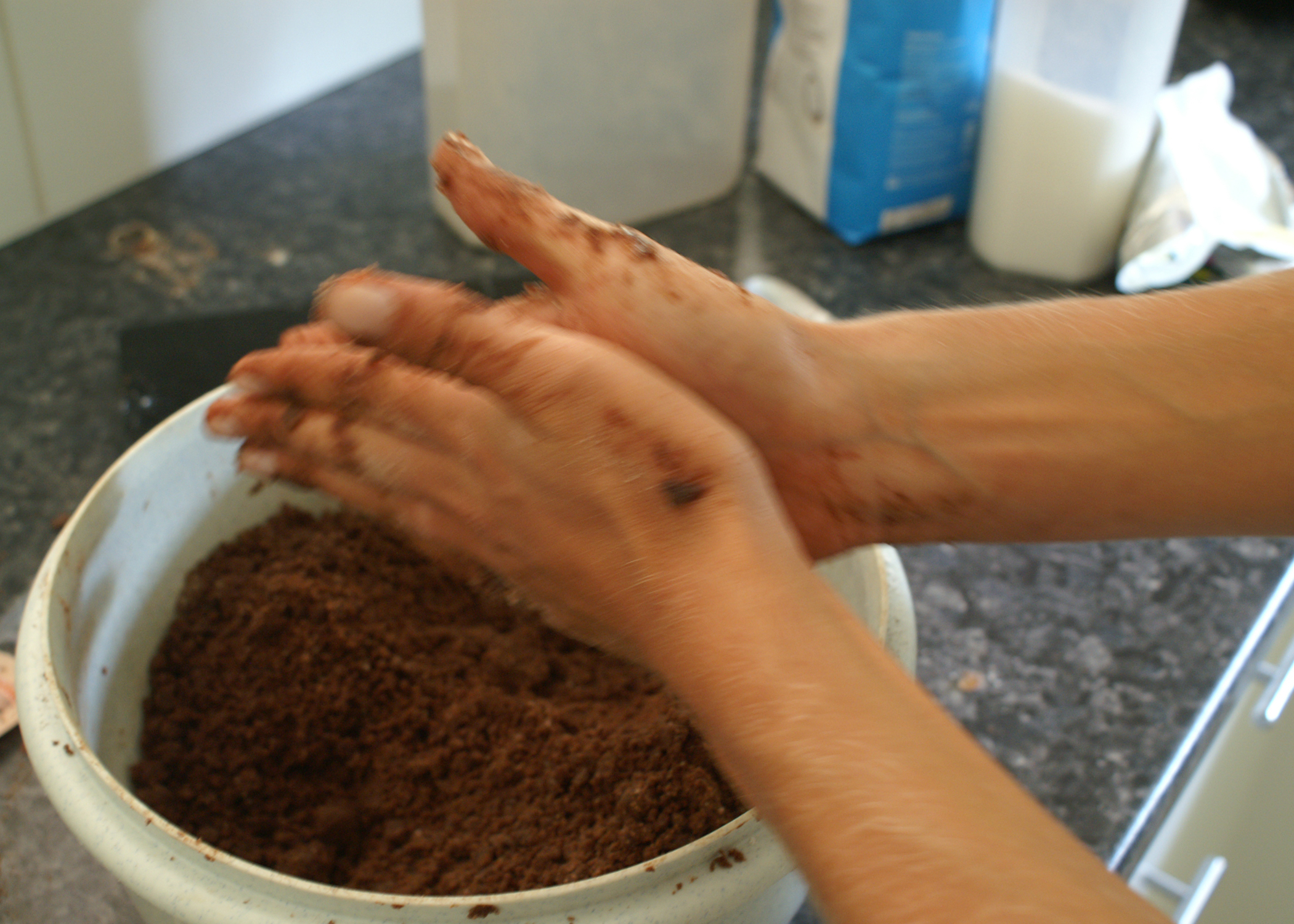 Zuerst den Kakaoteig zubereiten. Dazu Zucker, Kakaopulver, Mehl und Backpulver mischen und die weiche Butter in Stückchen dazugeben. Die Masse mit den Händen gut verkneten. Da daraus ein Mürbeteig entstehen soll, den Teig nach dem Kneten zwischen den Händen reiben. So entstehen kleine Krümeln.