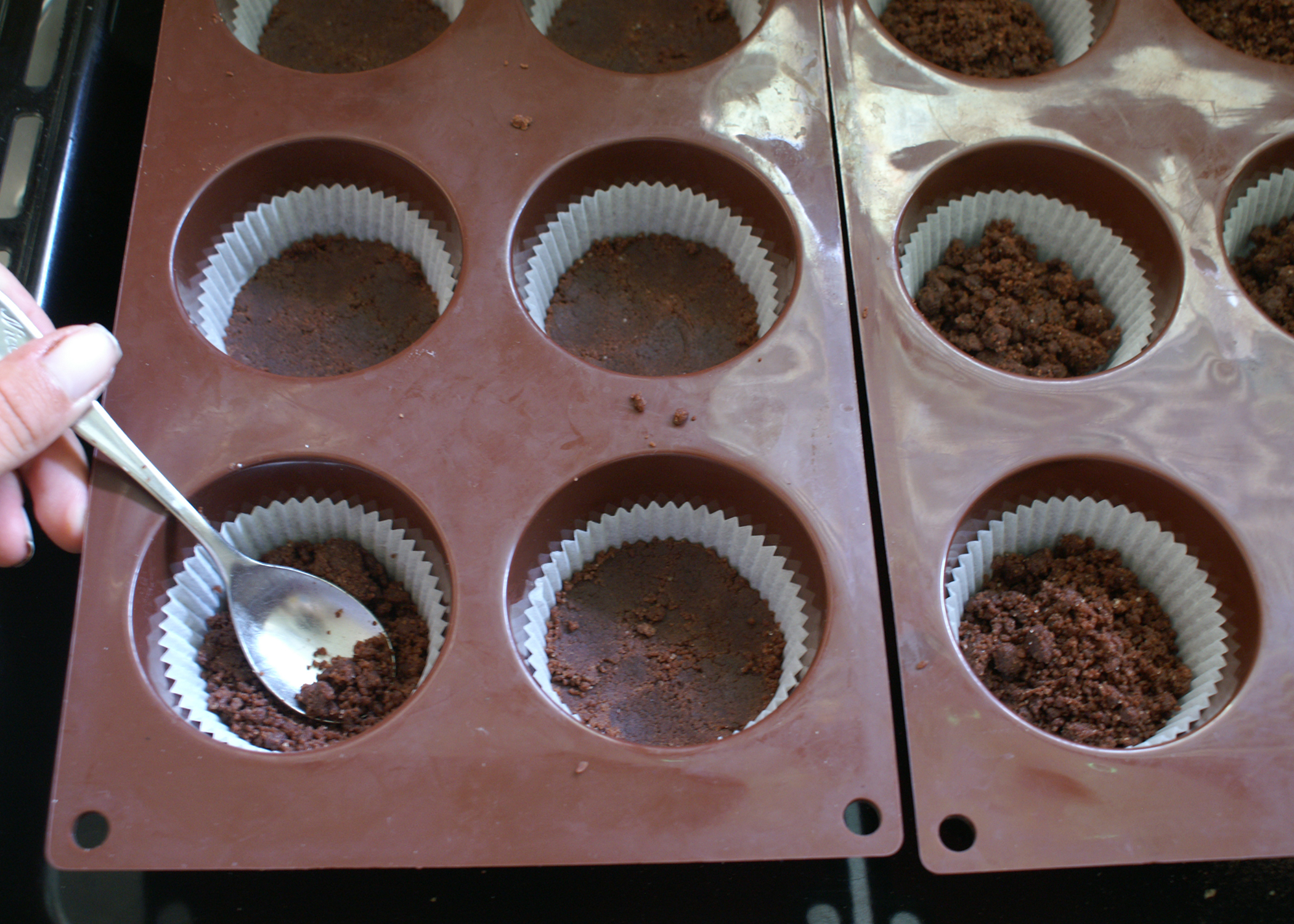 Nun 2/3 von diesem Teig in die Förmchen verteilen und mit einem Teelöffel oder den Händen gut am Boden andrücken. Das andere Drittel des Teiges wird später verwendet.