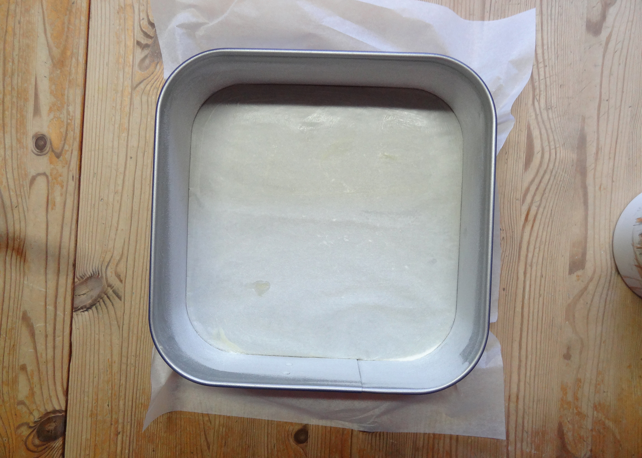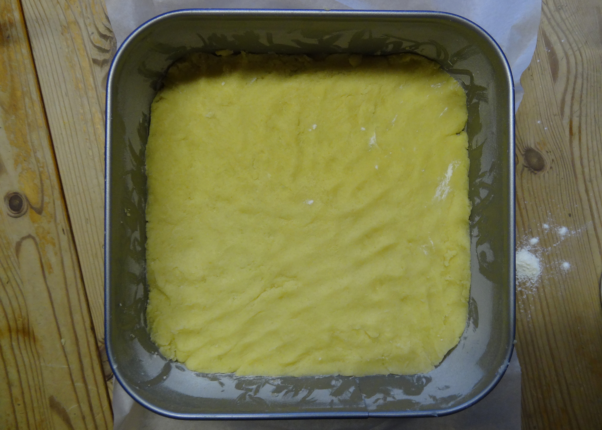 Eine quadratische Form (24x24cm) mit Backpapier auslegen, gut einfetten und bemehlen. Den Backofen auf 175° vorheizen.