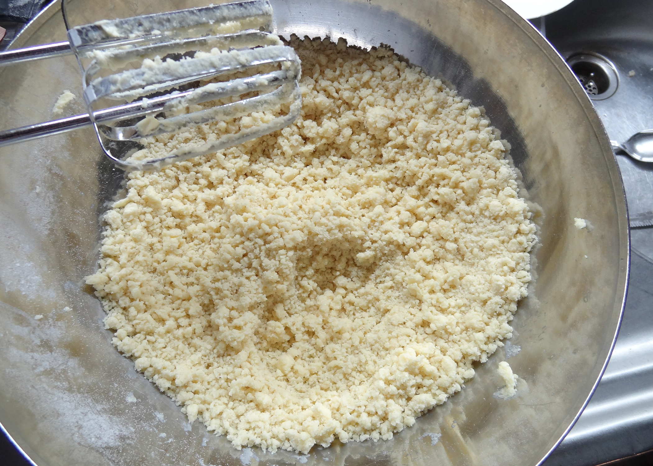 Für den Teig Mehl, Zucker, Salz und Backpulver vermischen. Die Butter in kleine Stücke schneiden und dazugeben. Alles gut verrühren.
