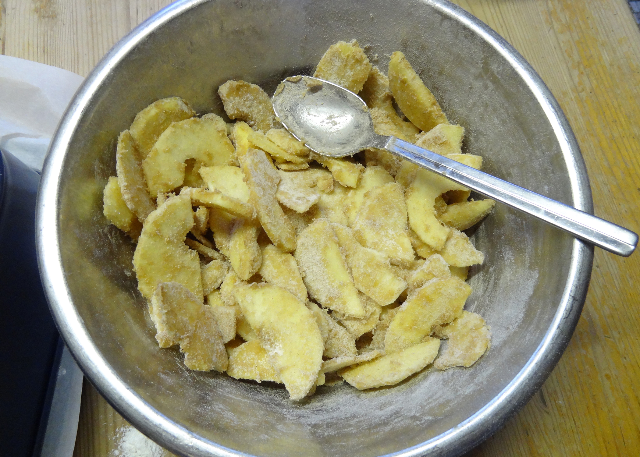 Für die Apfelfüllung die Äpfel schälen, entkernen und in feine Scheiben schneiden. Diese dann mit Mehl, Zucker und Zimt gut vermischen und auf den Teig verteilen.