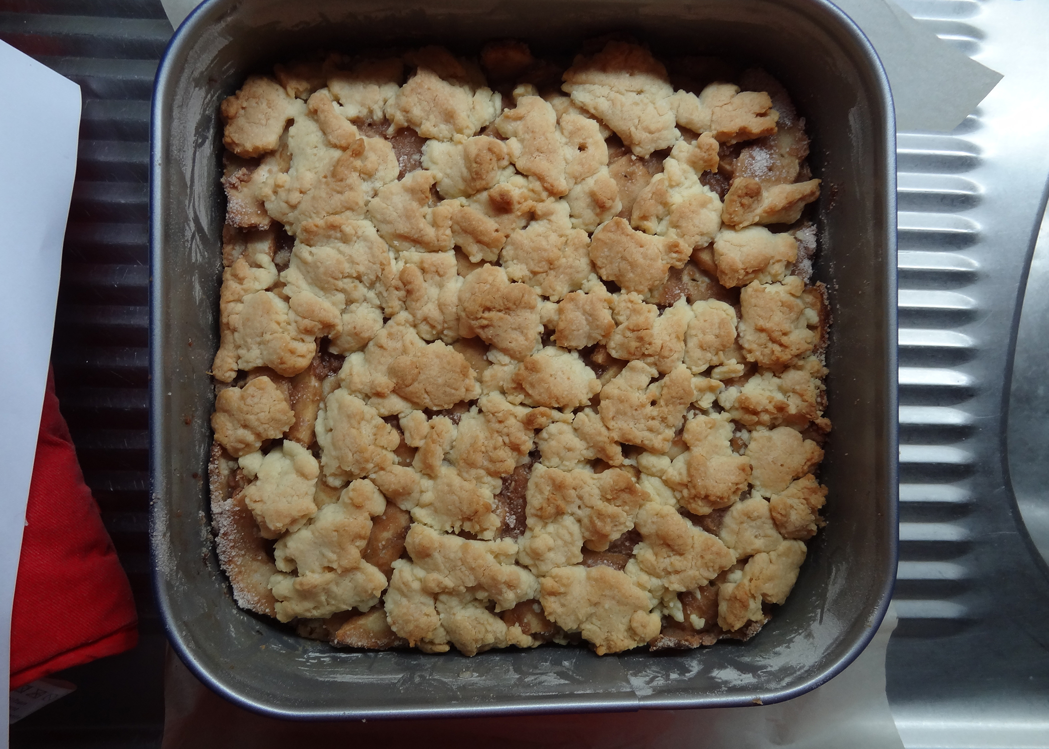 Den aufgehobenen Teig in Stücken über die Apfelfüllung verteilen, sodass diese mehr oder weniger bedeckt ist. Das Ganze während 40min backen und ganz auskühlen lassen.