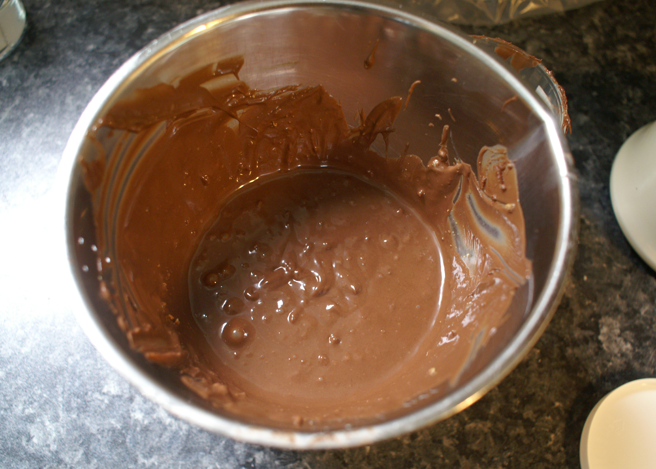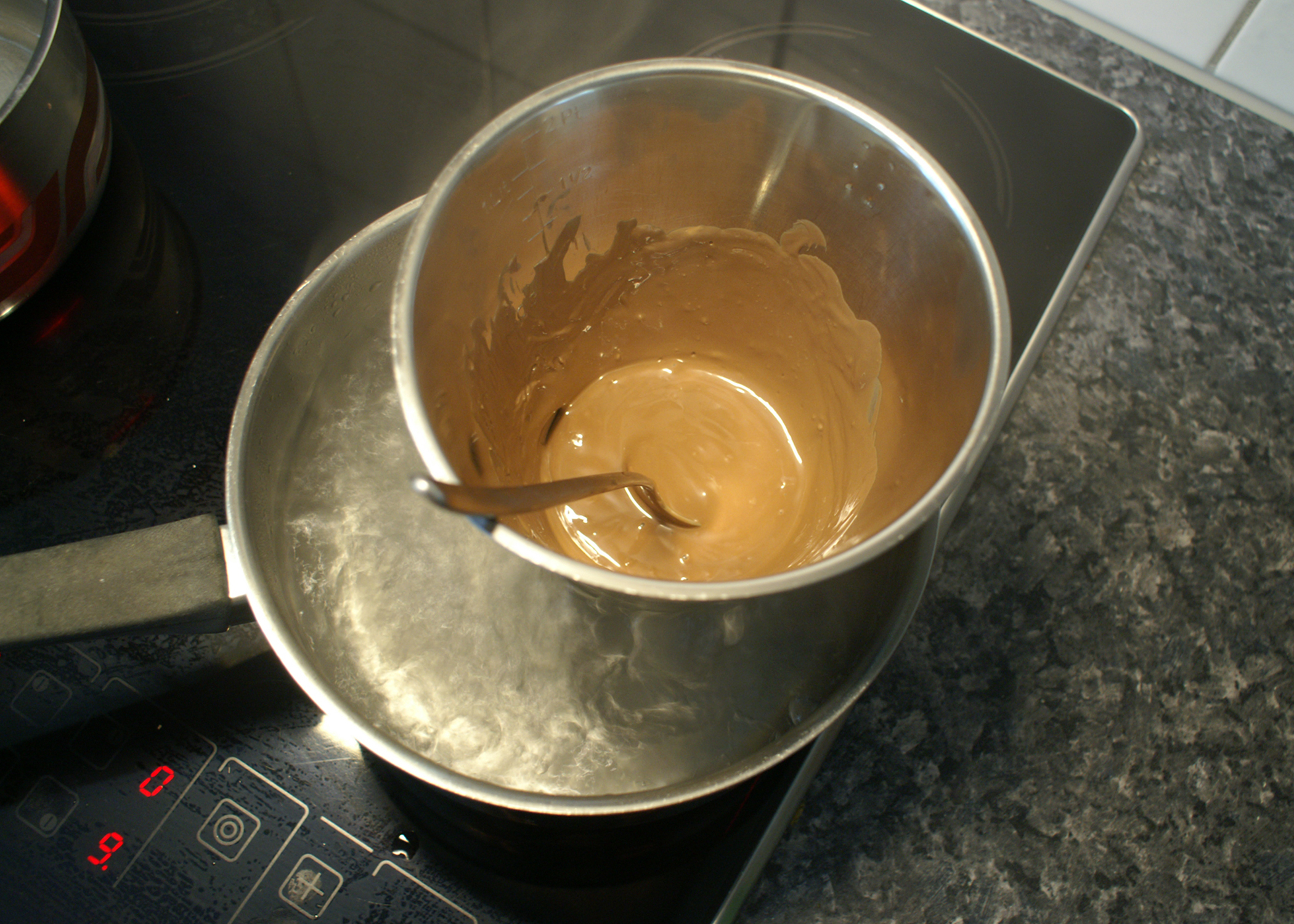 In einem Wasserbad die Schokolade schmelzen. Währenddessen bereits 4 Biskuits in einem Gefrierbeutel zerkleinern.