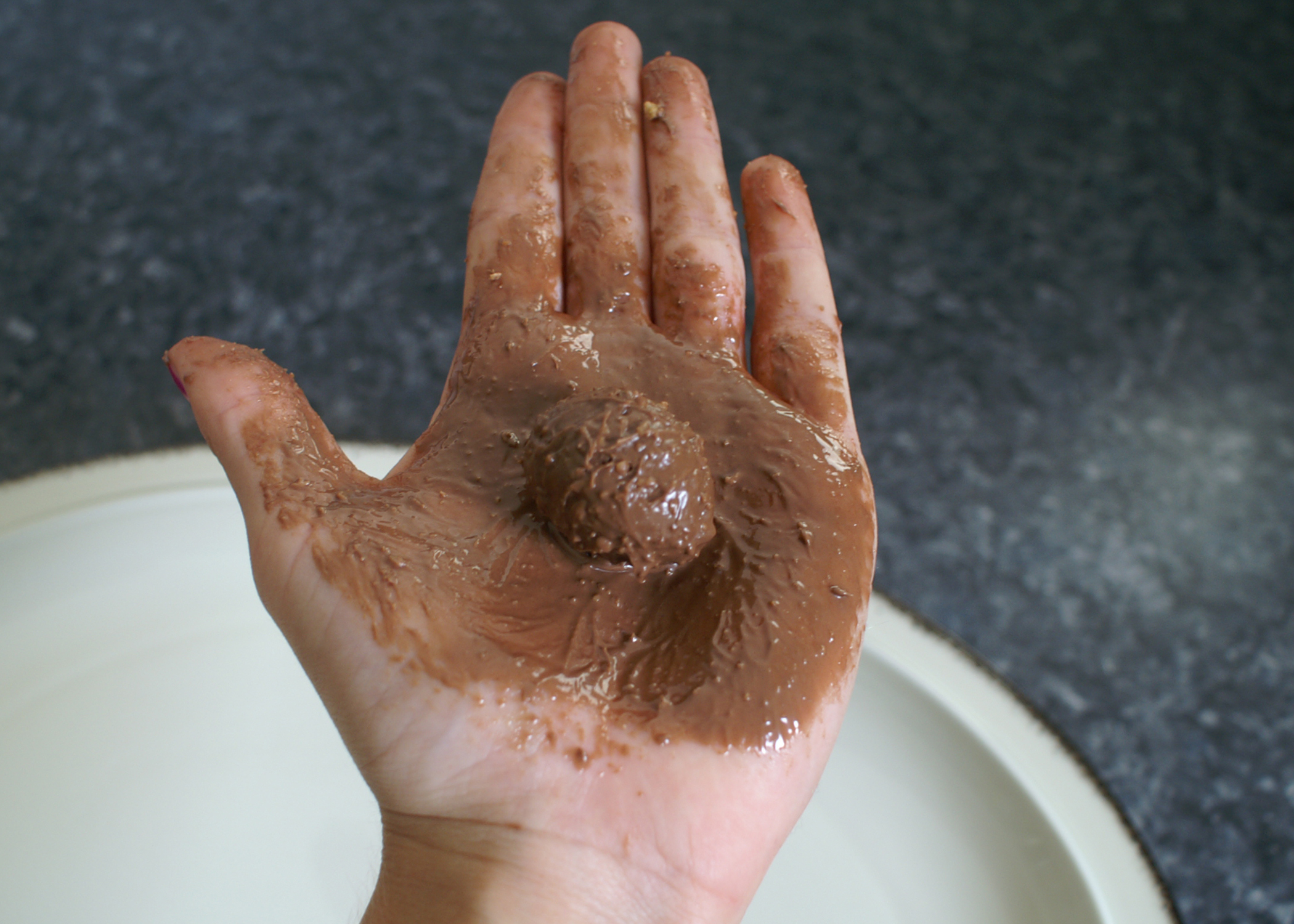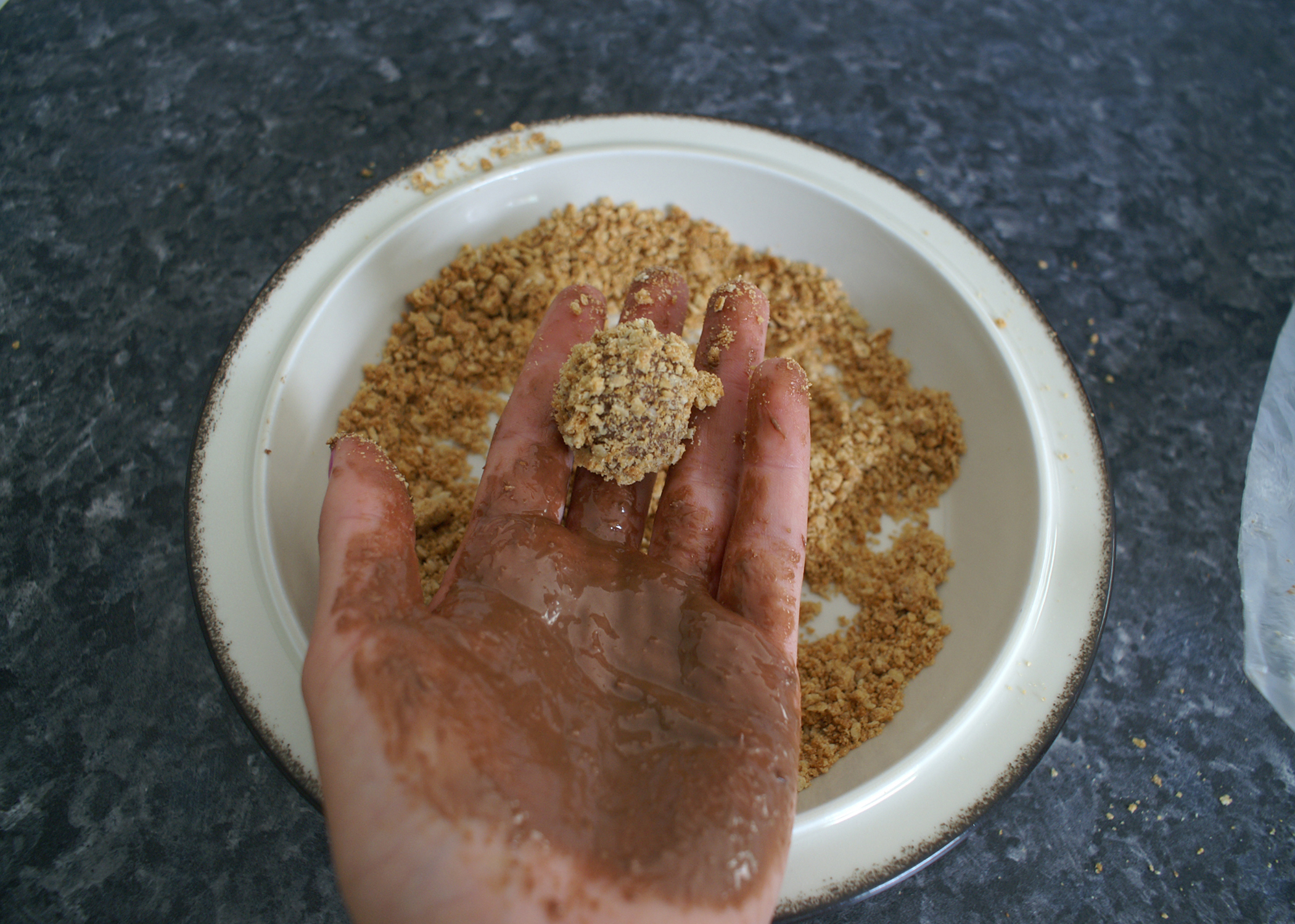 Diese Schokoladenmasse nun für ca. 1h in das Gefrierfach stellen. Sobald die Masse hart ist, herausnehmen. Die restlichen Biskuits auf die gleiche Art wie schon zuvor klein hacken und in in ein Suppenteller geben. Jetzt kann mit dem Formen der Pralinen begonnen werden. Dazu mit einem Teelöffel etwas von der Schokoladenmasse nehmen und in den Händen zu einer Kugel formen. Anschliessend in den zerkleinerten Biskuits wenden und auf einen Teller geben.