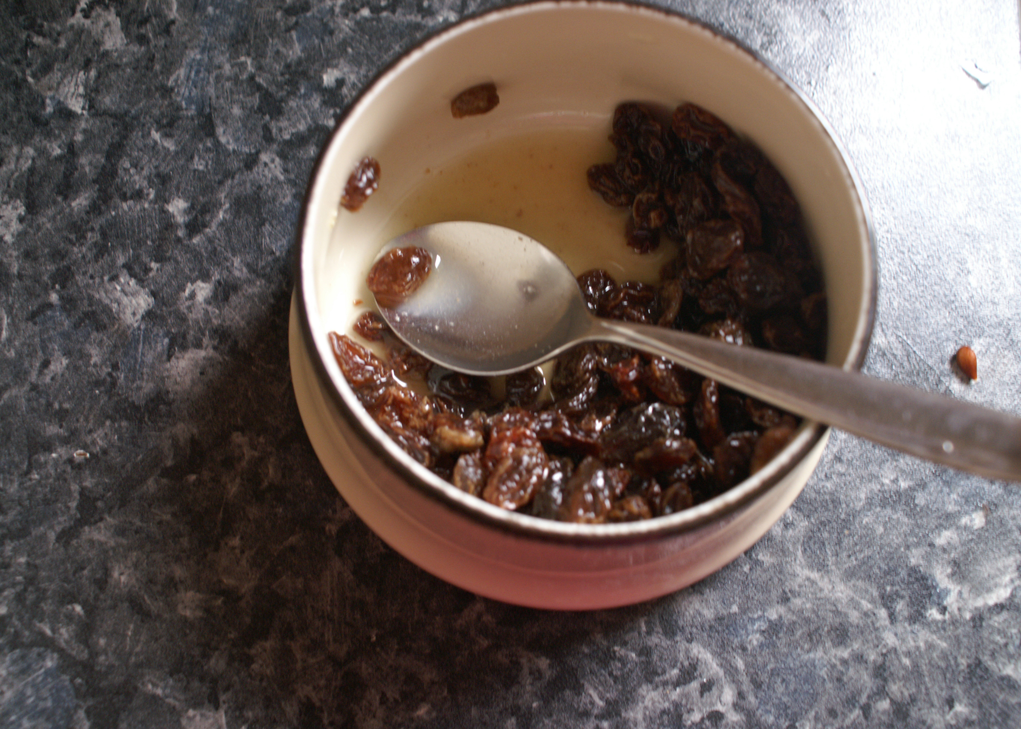 Die Rosinen waschen und mit Küchenpapier trocknen. Dann in eine Schüssel geben und mit Zitronensaft, Zucker und Bittermandelaroma mischen.