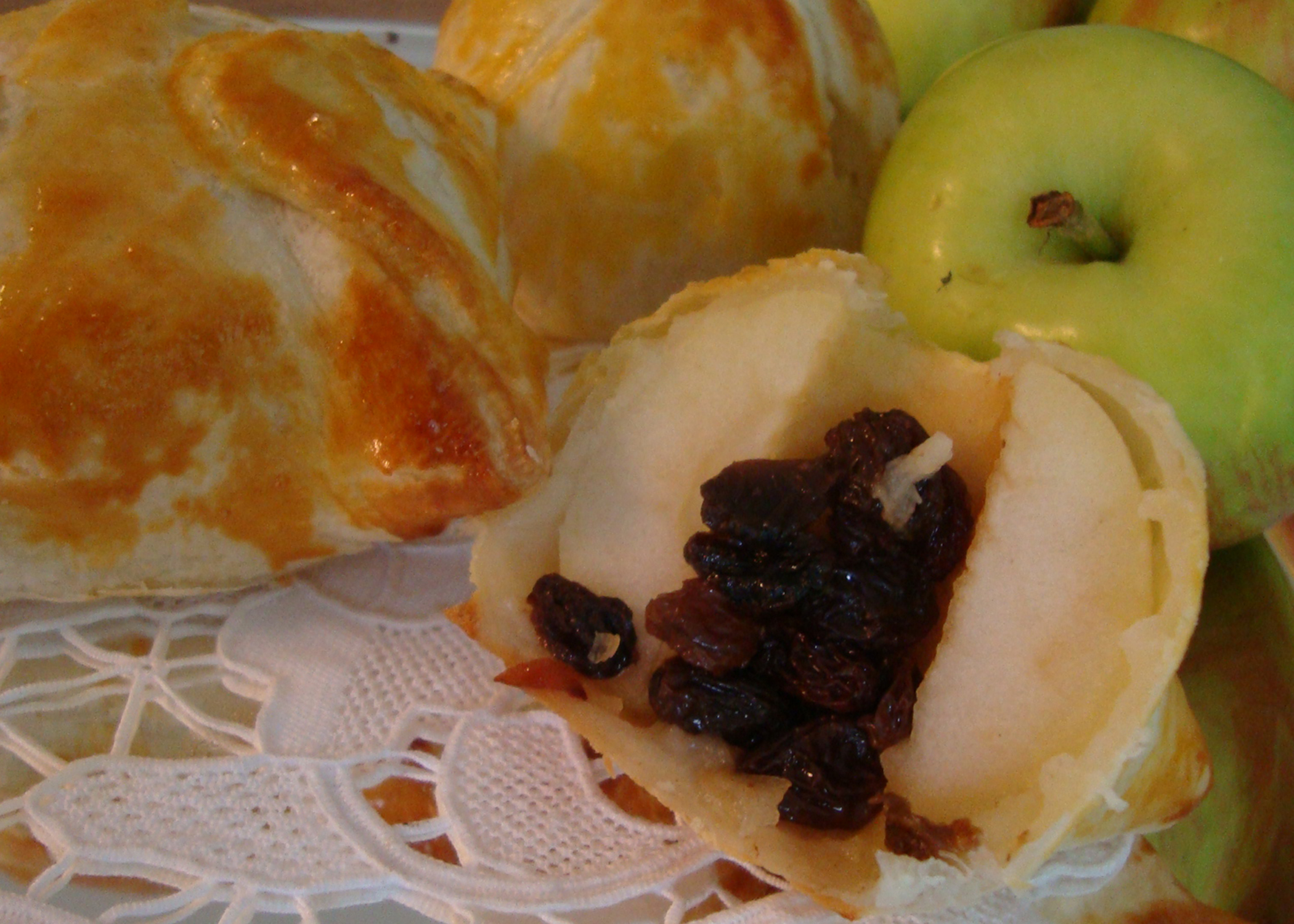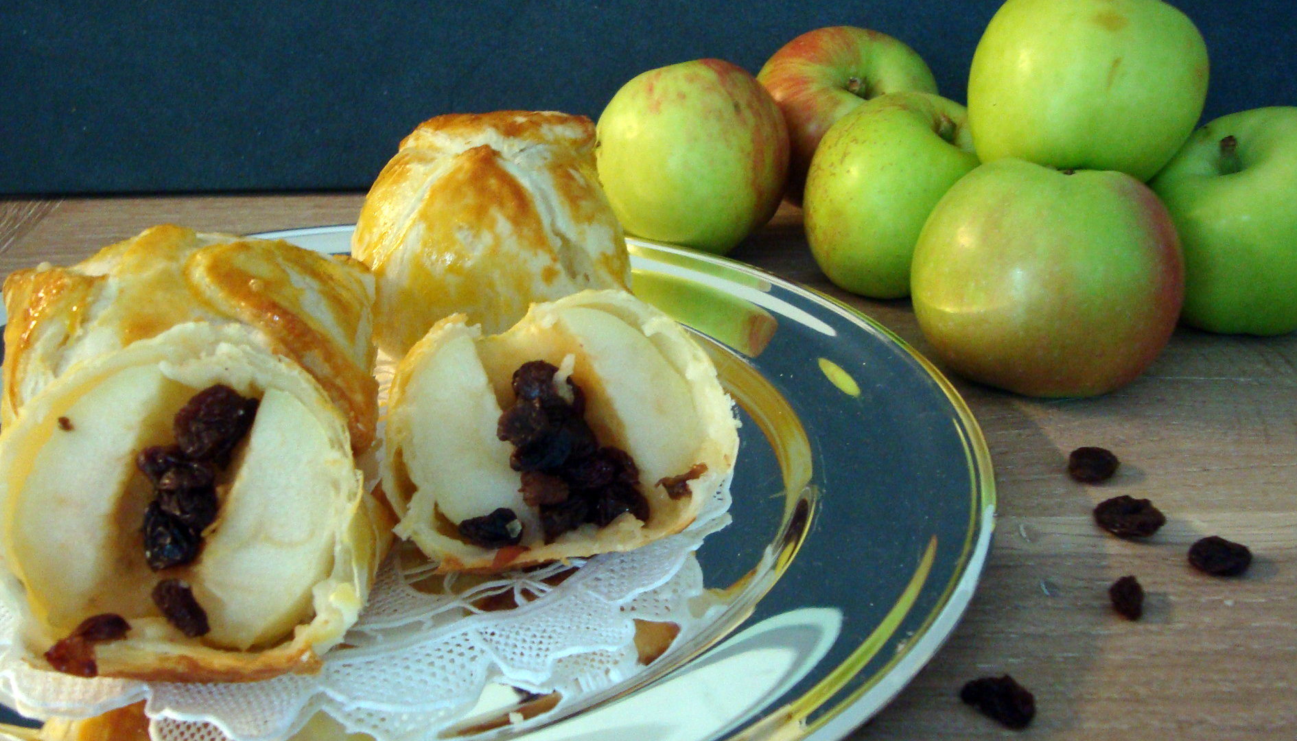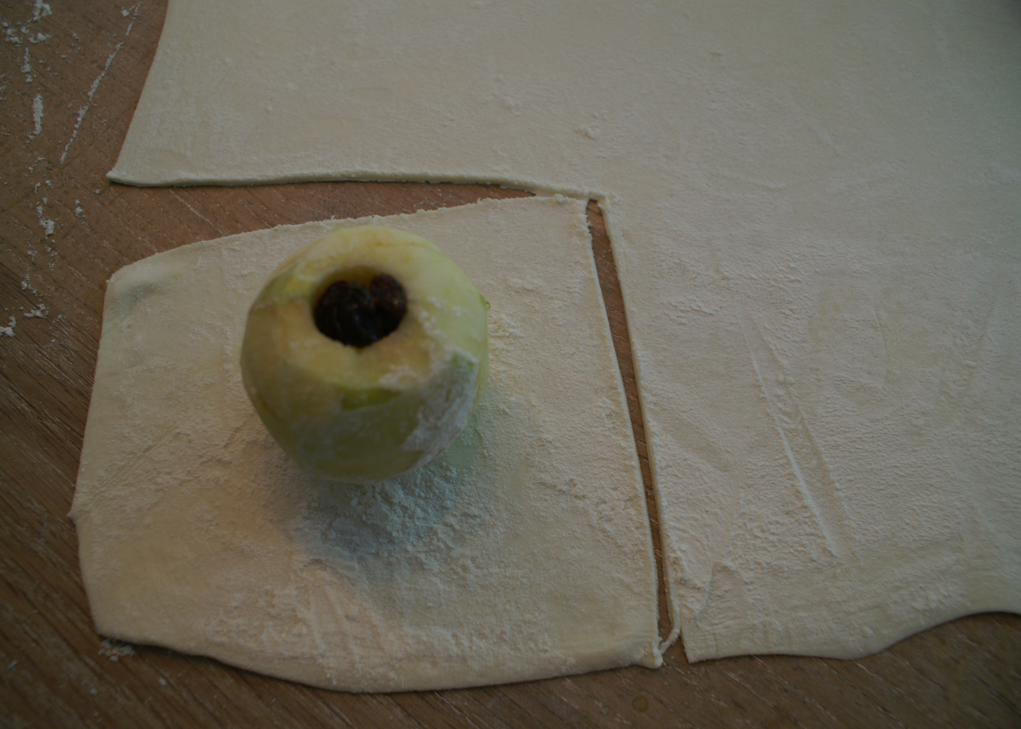 Da Ei trennen. Den Blätterteig ausrollen und in sechs gleich grosse Stücke schneiden. Auf jedes Stück einen Apfel geben. Nun die Löcher in den Äpfel mit den Rosinen füllen. Die Ränder mit Eiweiss bestreichen und jeden Apfel mit Teig einwickeln. Den Teig gut andrücken. Dann die Teigtaschen mit Eigelb bestreichen.