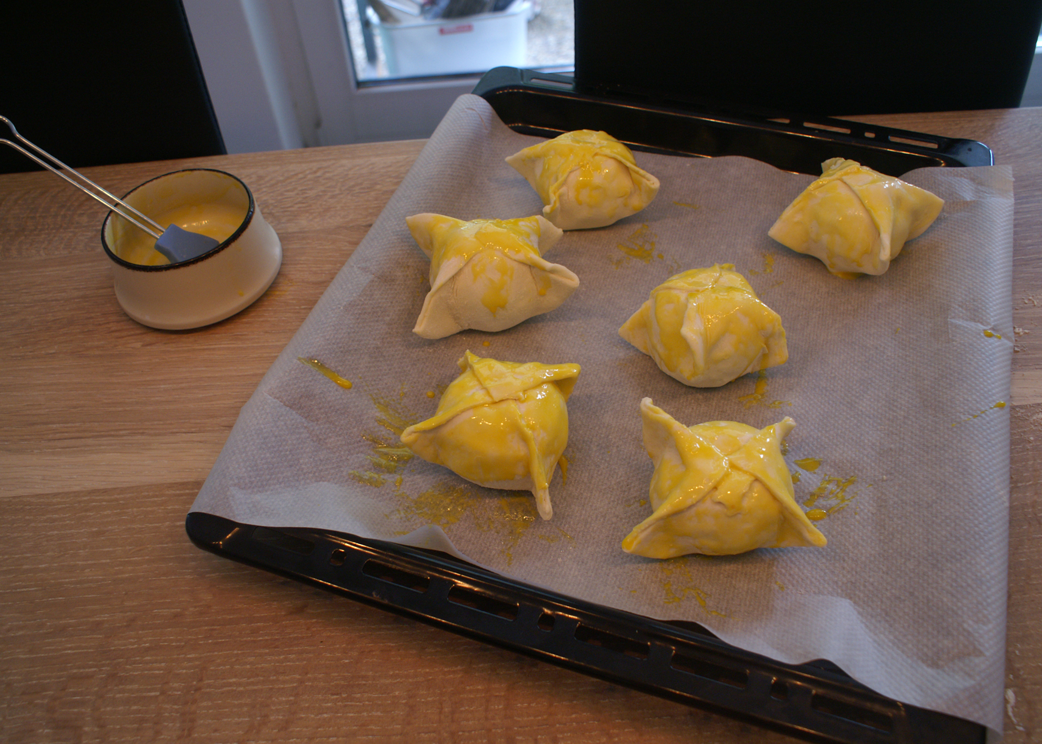 Alle 6 Teigtaschen auf ein mit Backpapier belegtes Blech geben und für 25 Minuten backen.