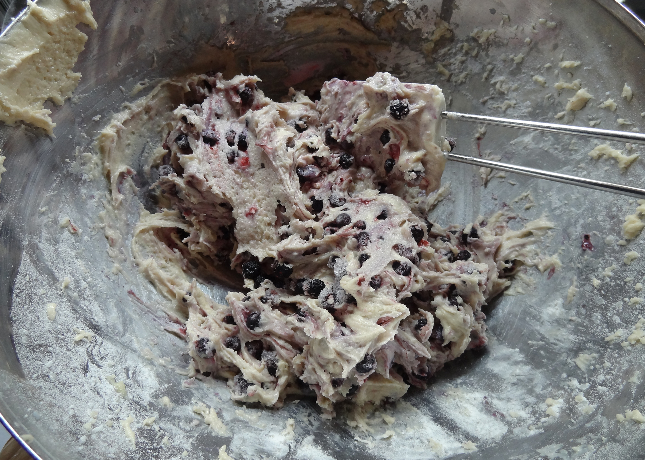 Das Mehl mit dem Backpulver, Salz und Zimt vermischen und abwechslungsweise mit der Buttermilch unter die Masse rühren. Zum Schluss die gefrorenen Heidelbeeren von Hand vorsichtig unterheben.