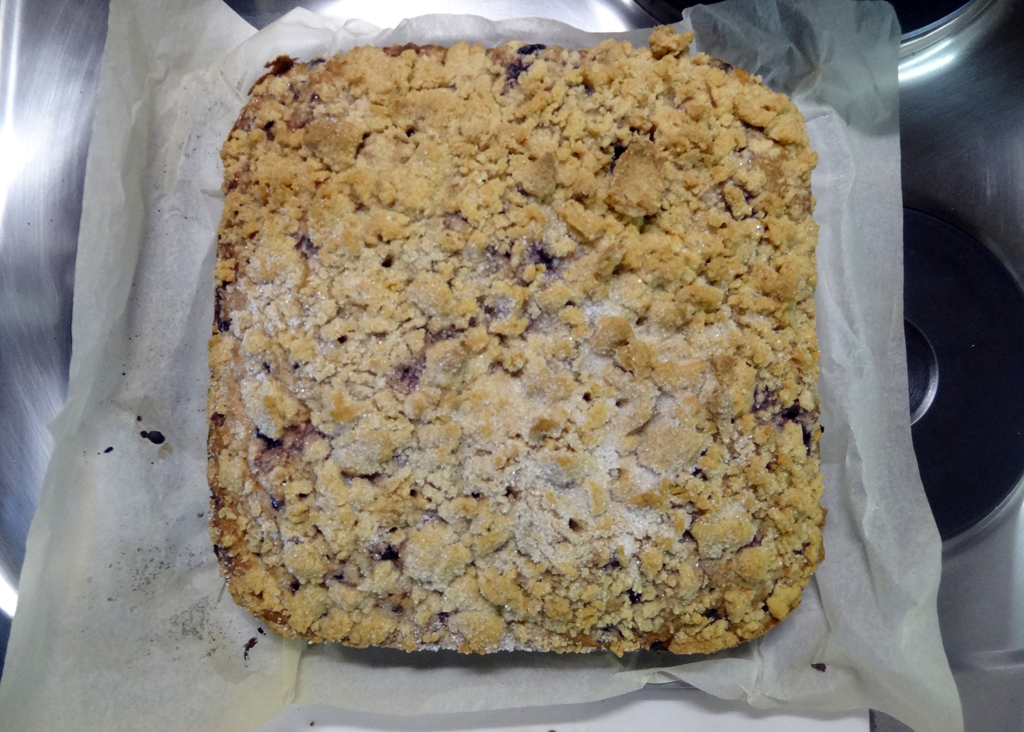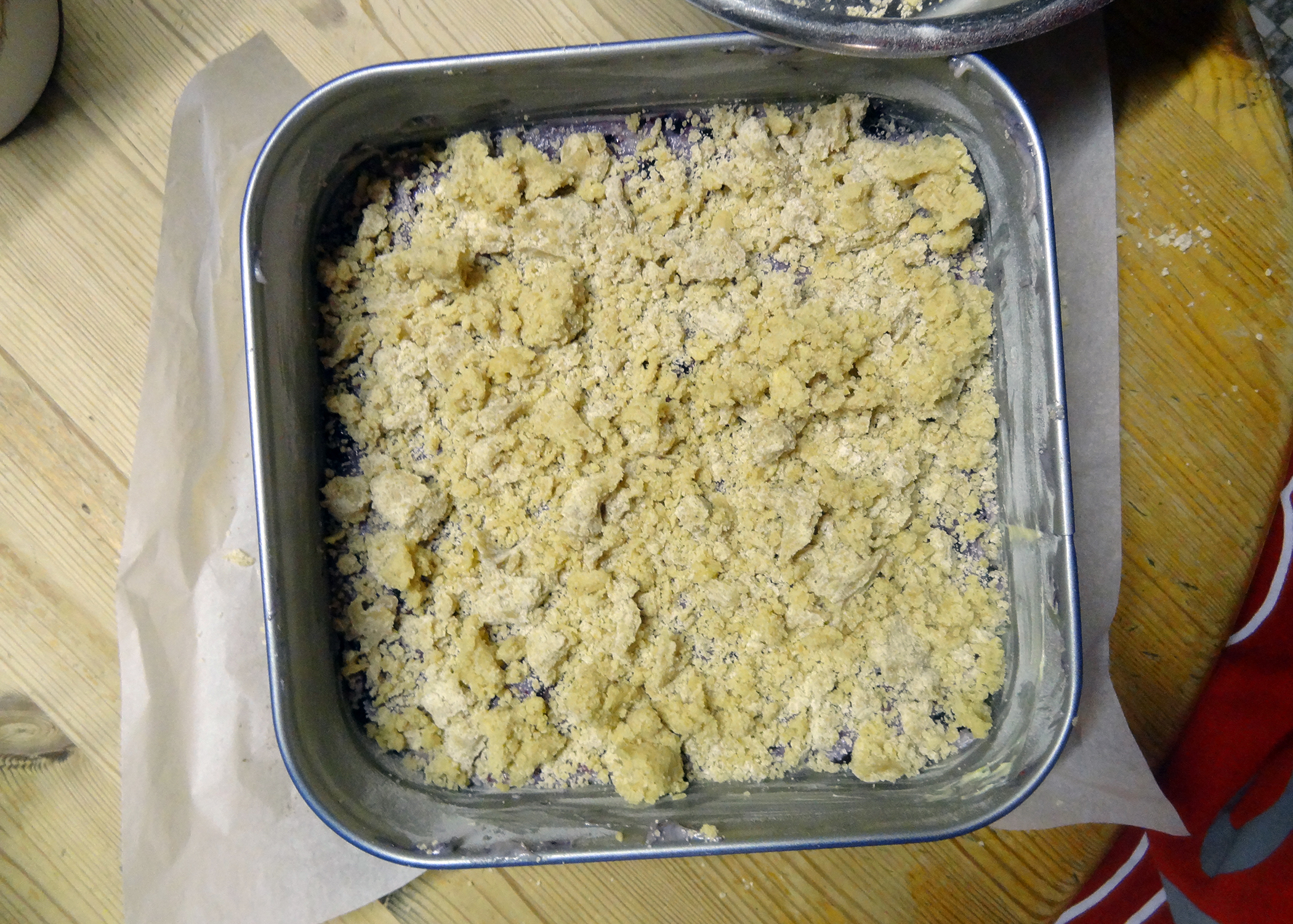 Den fertigen Teig in die Form geben und gleichmässig verstreichen.Anschliessend die vorbereiteten Streusel darauf verteilen und für 50-55min backen. (Stäbchenprobe mit einem Zahnstocher oder einer Stricknadel machen, um zu sehen ob noch Teig hängen bleibt)