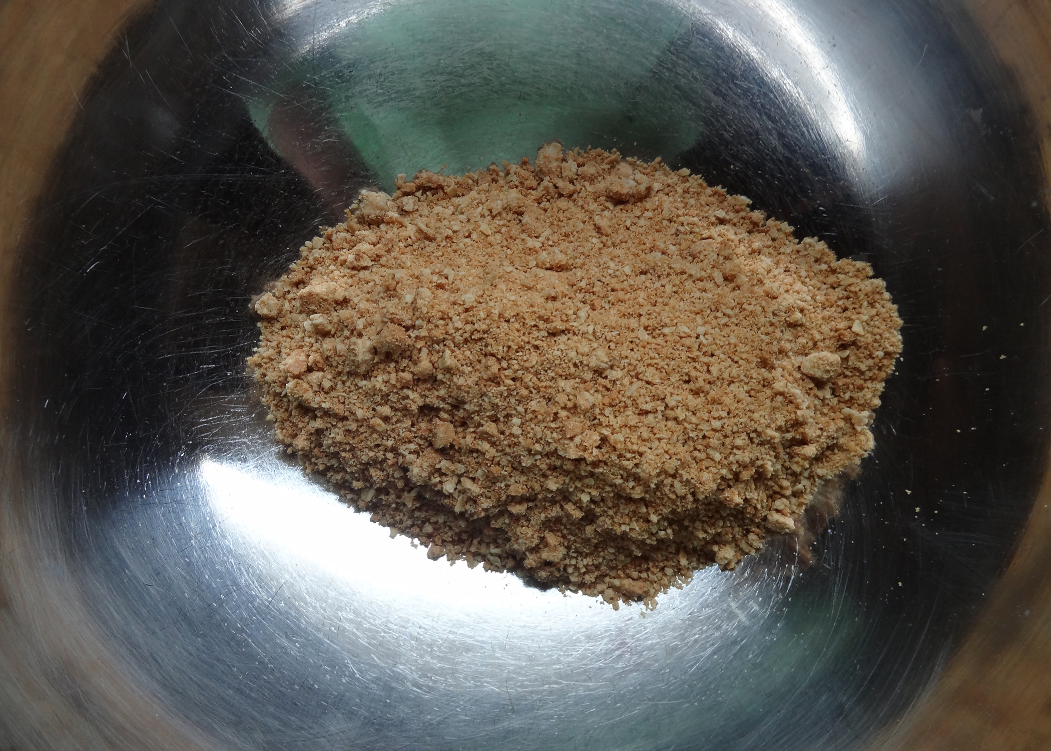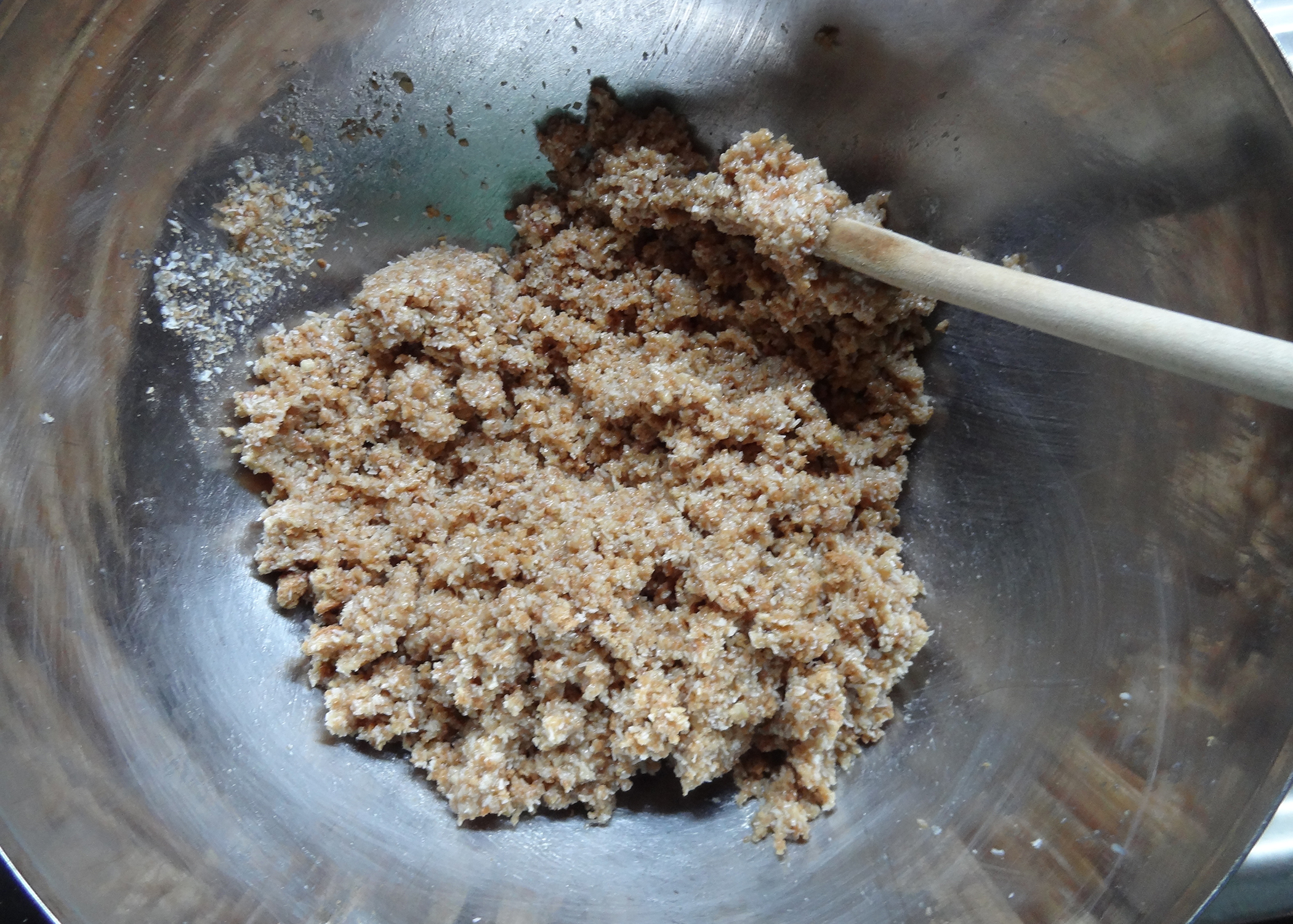 Die Haferguetzli in einen Gefrierbeutel geben und mit einem Fleischhammer zerstampfen, bis nur noch feine Brösel übrig sind. Diese dann in eine grosse Schüssel geben.