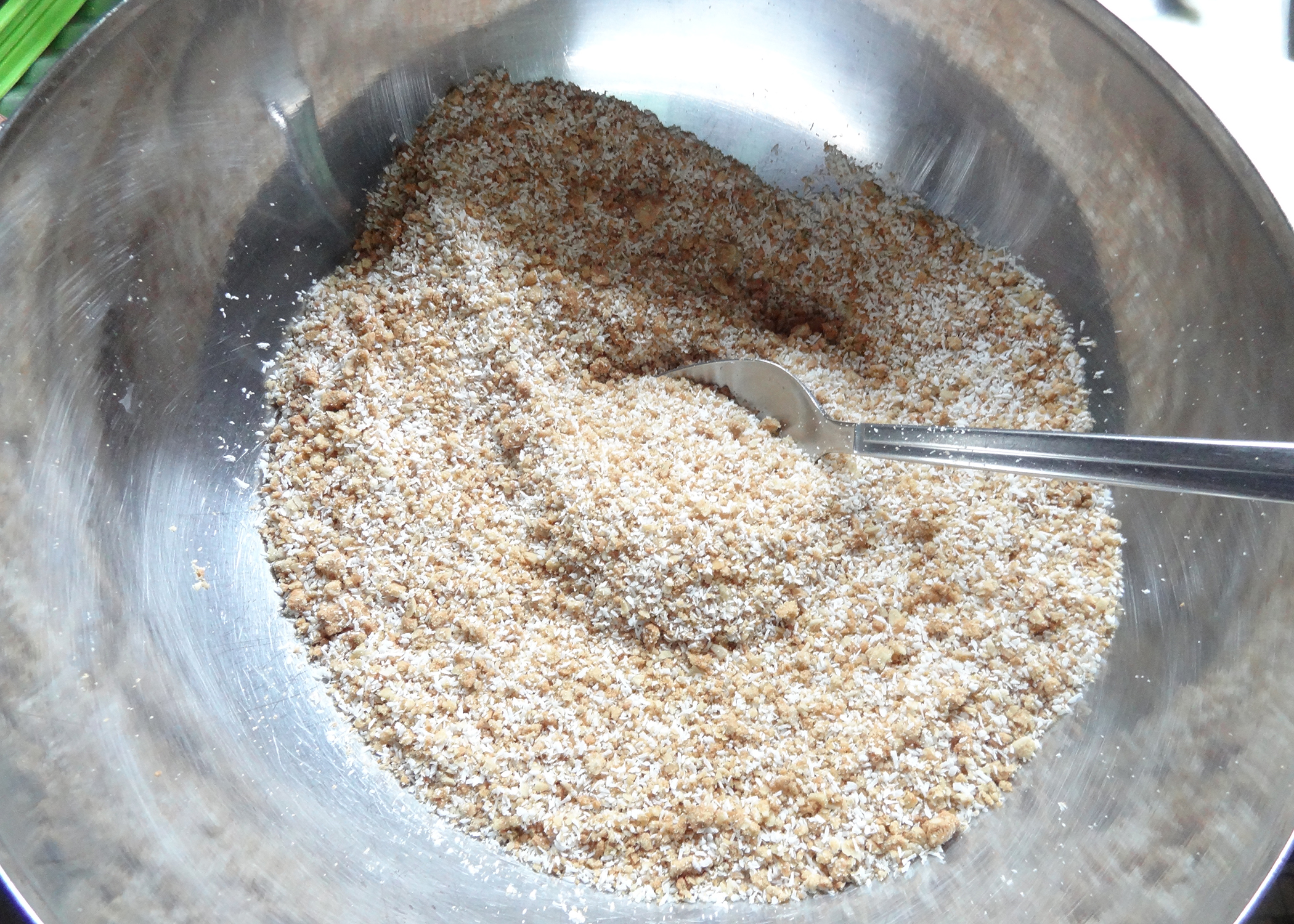 Dann die Milchmischung zur Bröselmischung geben und alles verrühren, sodass eine dicke, feuchte Masse entsteht. Diese anschliessend in die Form drücken. Je nachdem wie dick die Stücke werden sollen, nicht in der ganzen Form verteilen. Zum Schluss noch mit Kokosflocken bestreuen und für mindestens zwei Stunden in den Kühlschrank stellen.
