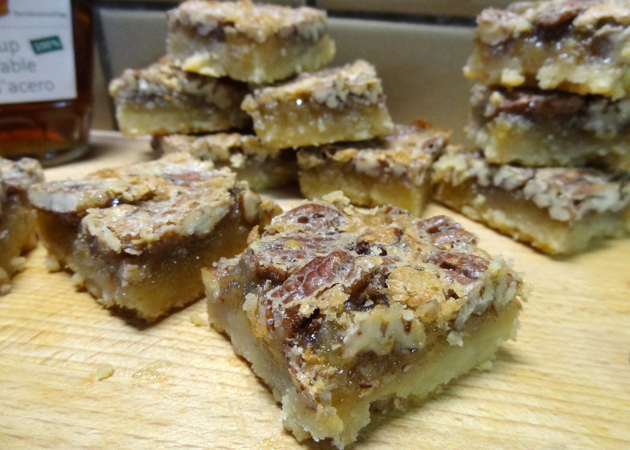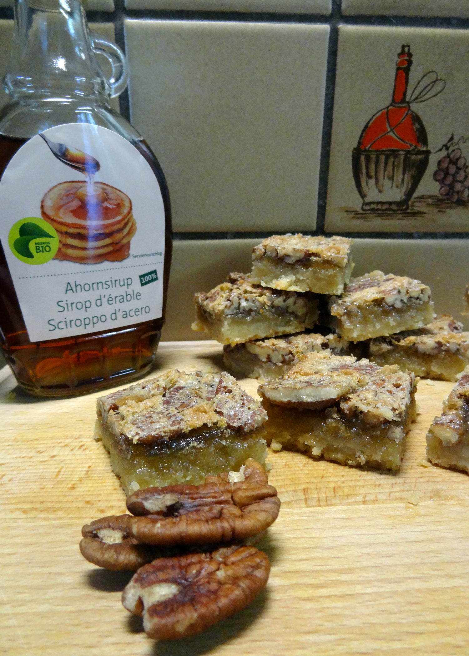 Die sogenannten Pecan-Bars sind sehr ähnlich wie der Pecan-Pie, nur halt mit einem etwas einfacheren Teig und in einer rechteckigen Form gebacken. Zum ersten mal habe ich sie entdeckt, als ich einem Freund etwas zum Geburtstag backen wollte, und dieser mir Pecan-Bars als „his favourite“ nannte. Ich verfiel den kleinen nussigen und wahnsinnig süssen Dingern sofort, und ass von diesem Tag an in jedem Café stehts Pecan Pie for dessert!
