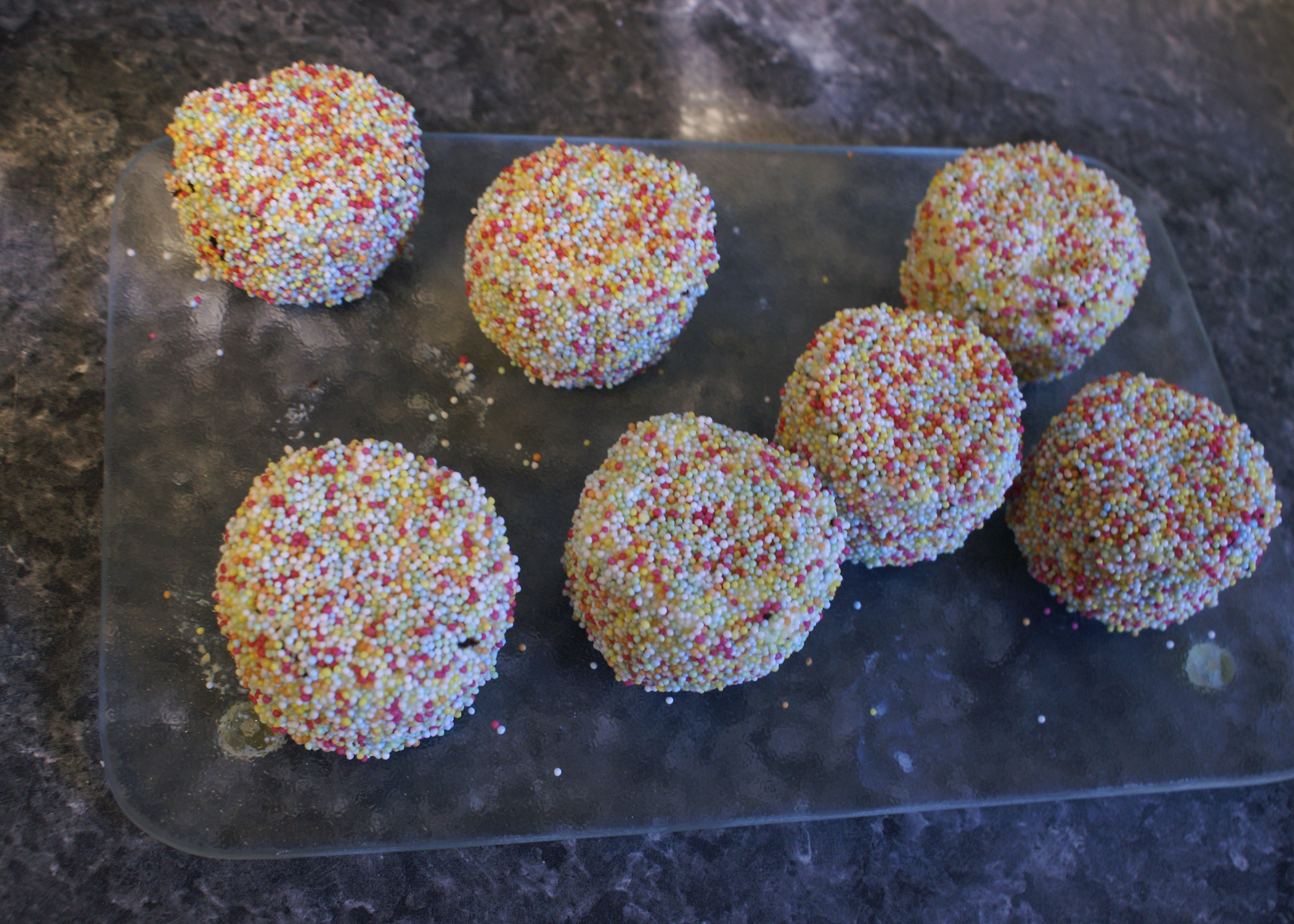 Um den Küchlein ihren farbigen Schliff zu verleihen, die Zuckerstreusel in einen Teller geben.Die Buttercreme aus dem Kühlschrank nehmen. Nun muss jedes Küchlein mit der Buttercreme eingestrichen werden. Dazu nimmt man am besten ein Messer und verteilt die Creme als erstes auf der Seite und danach auf den Deckel. Das mit Buttercreme eingepackte Küchlein in den farbigen Zuckerstreusel wälzen und anschliessend auf einen Teller geben.