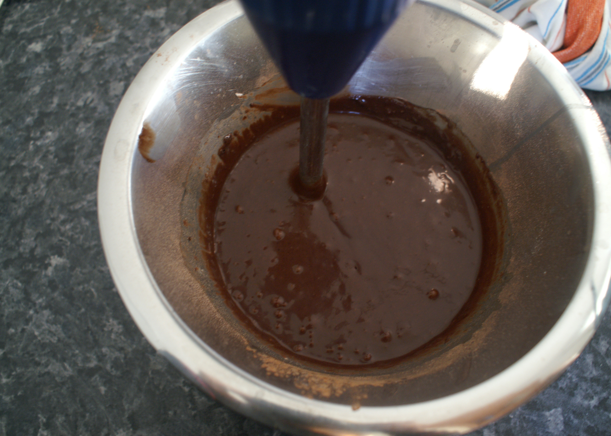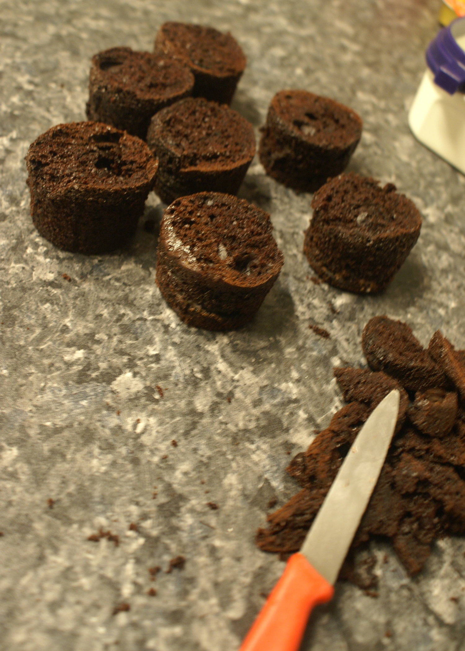 Nach dem Backen die Küchlein vollständig auskühlen lassen. Jetzt müssen sie vorsichtig aus den Förmchen befreit werden. Dazu am besten mit einer Schere vier Schnitte in die Seiten der Förmchen machen. Danach kann man die Schokoladenküchlein gut nehmen. Falls sie nicht eine glatte Oberfläche haben oder zu hoch sind, kann man mit einem Messer die oberste Schicht wegschneiden.